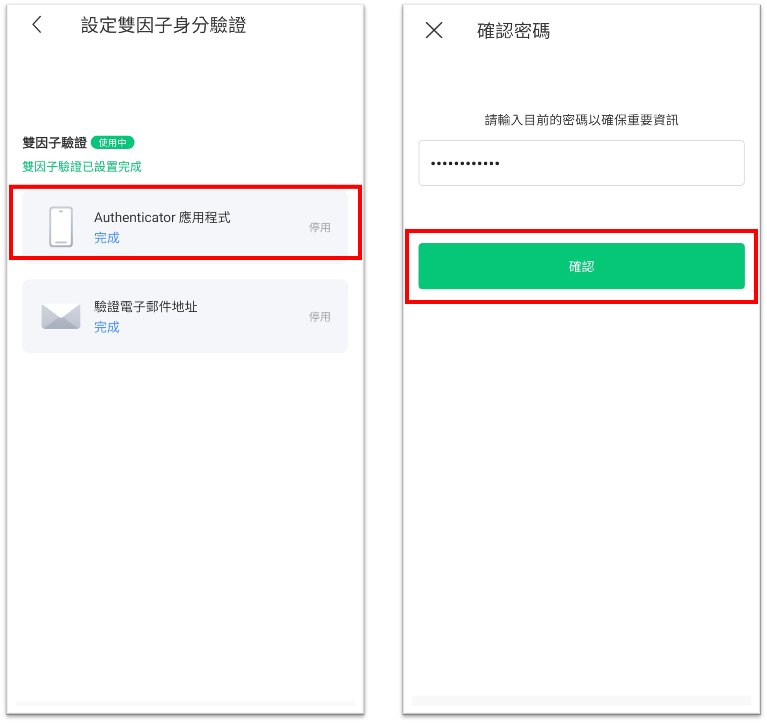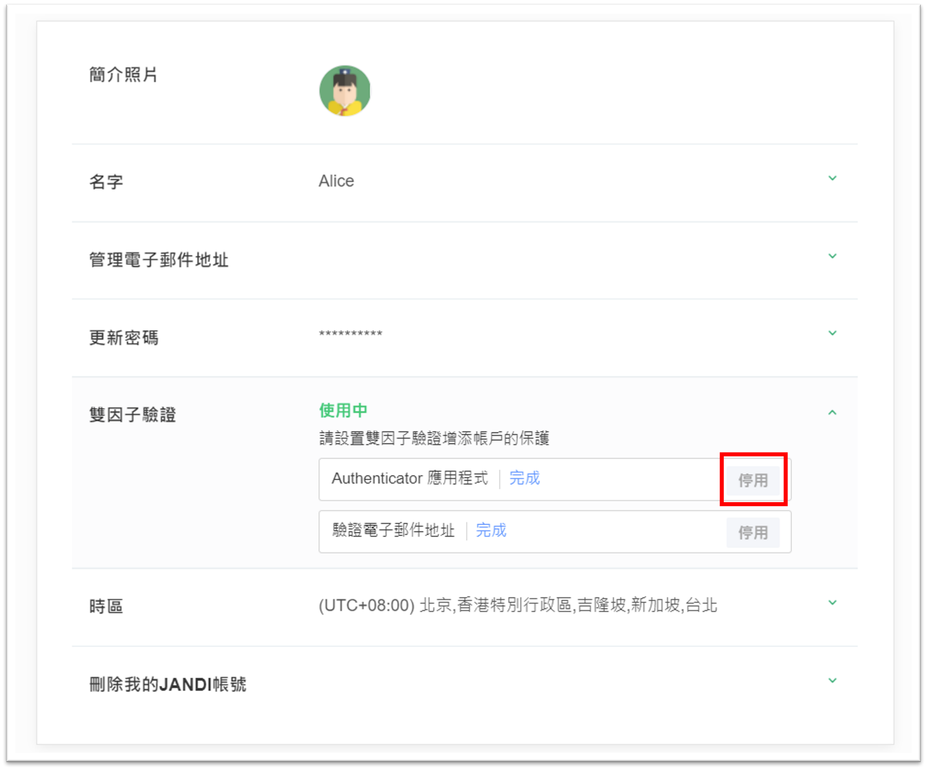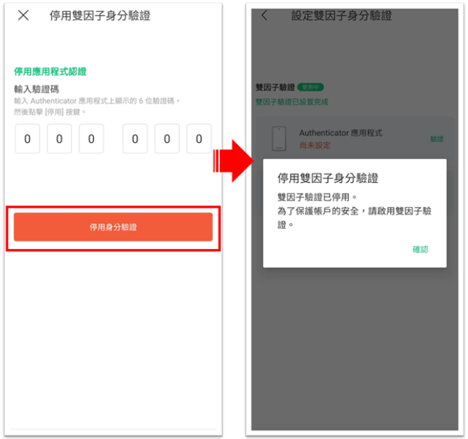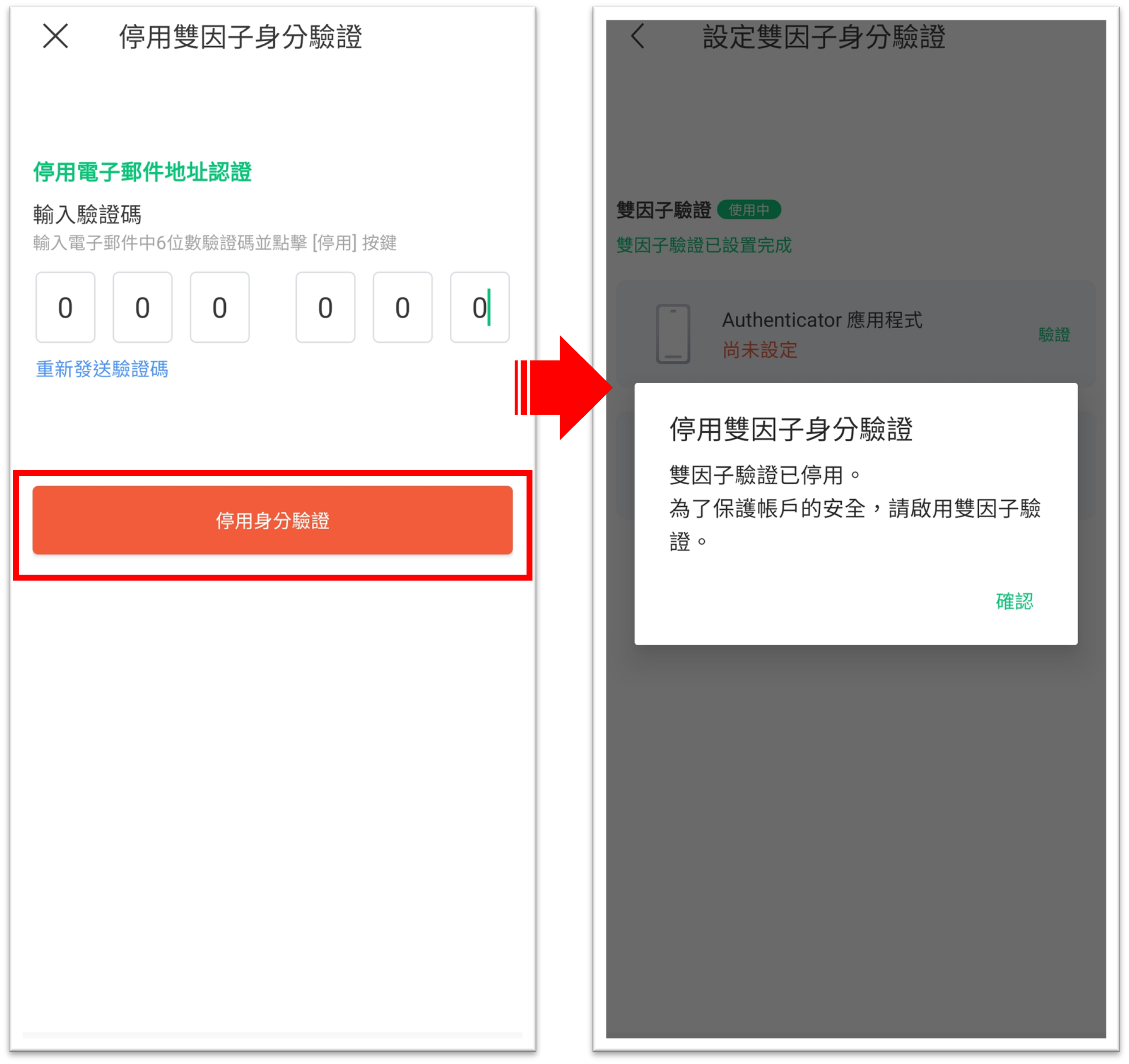 1. 帳戶設定中的 [雙因子驗證] > 請點擊應用程式驗證旁的 [停用]。