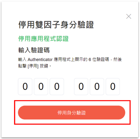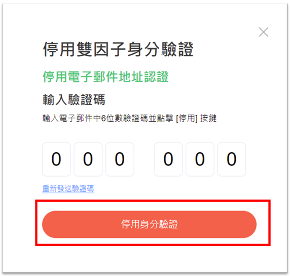 3. 請輸入電子郵件中之6位數驗證碼後,點擊 [停用]。