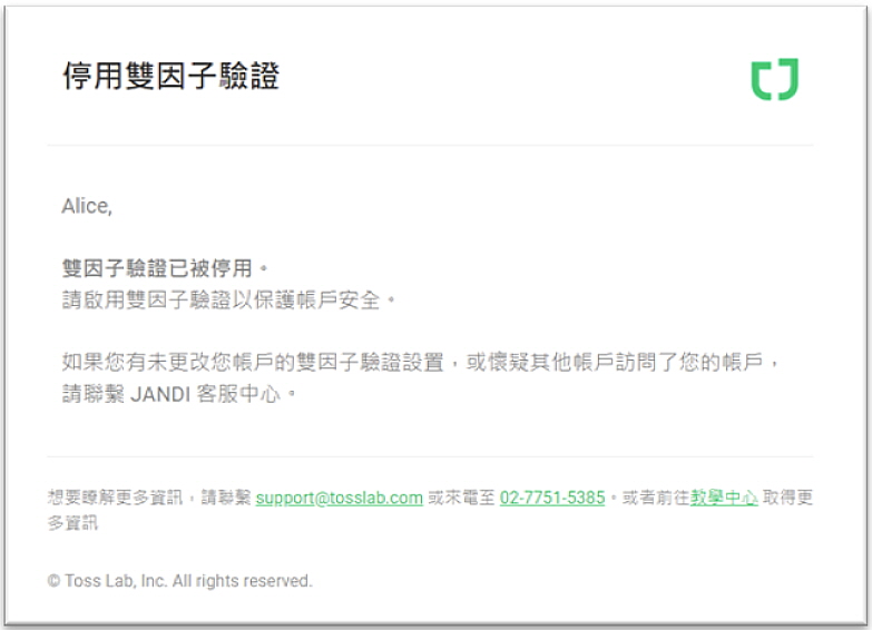停用雙因子驗證後,將發送電子郵件通知,如下圖。