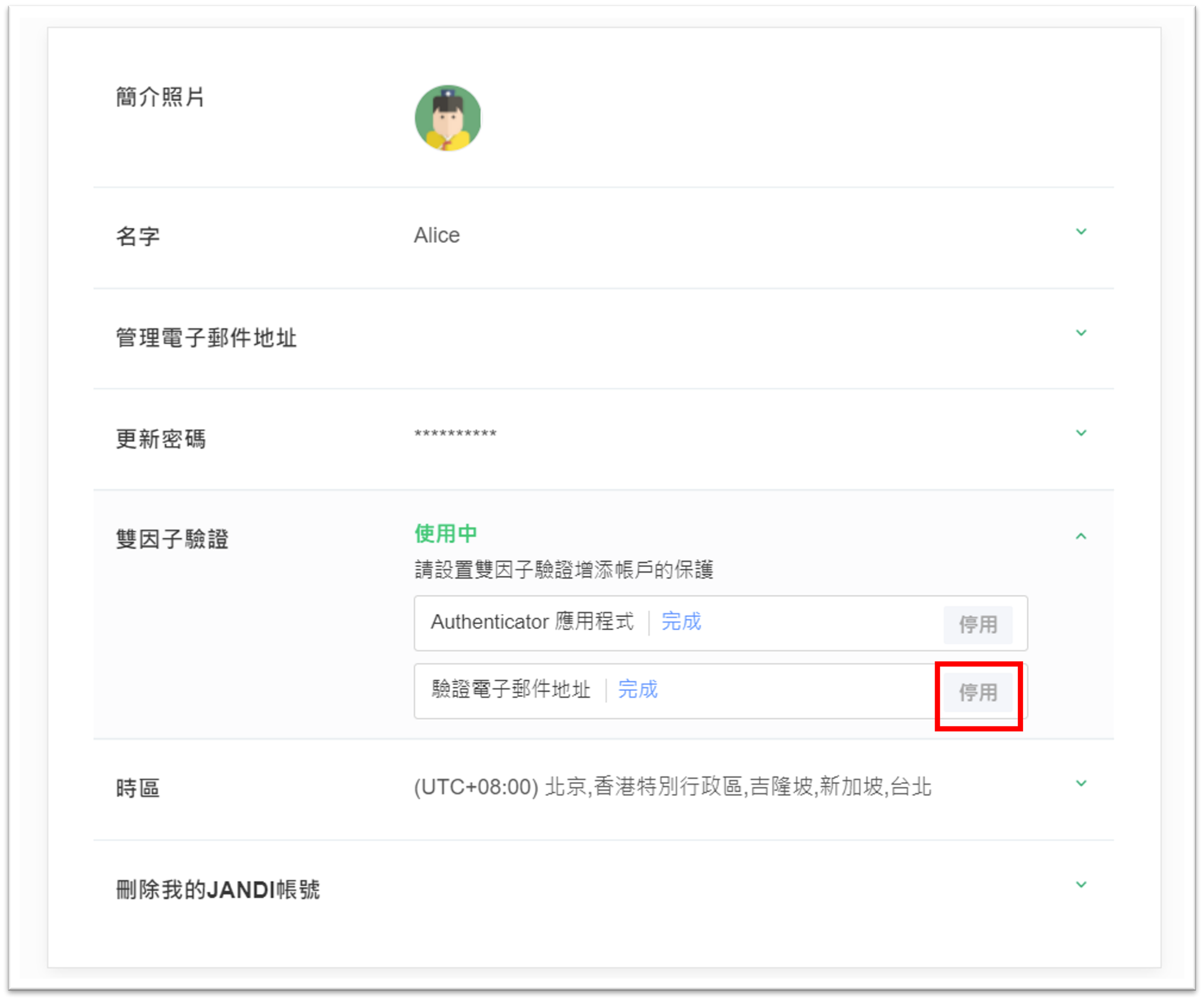 1. 帳戶設定中的[雙因子驗證] > 請點擊電子郵件地址驗證旁 [停用]。