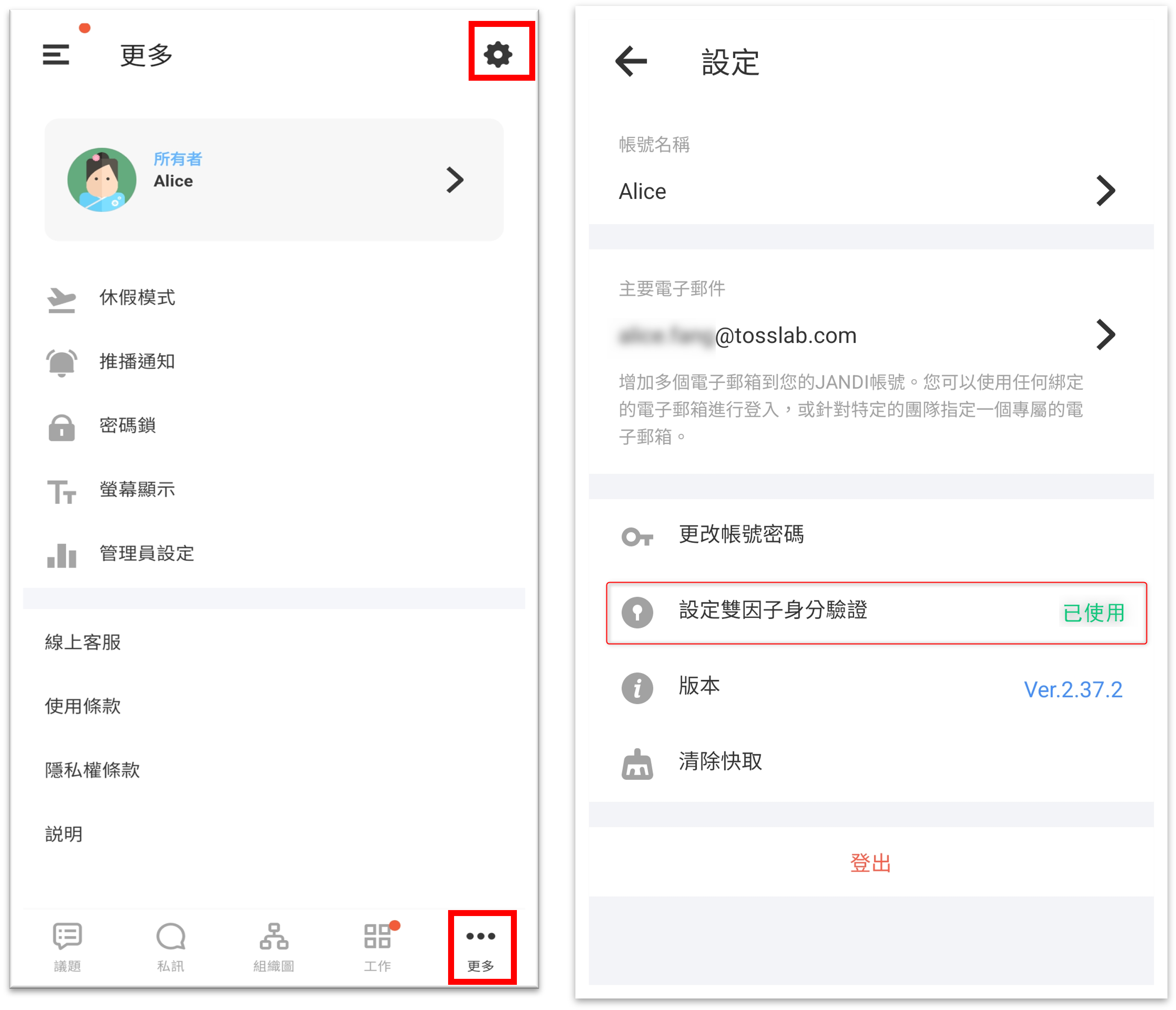 於JANDI 介面下方的 [...] 更多 > 右上角 [齒輪] 圖示 > 進入設定,點擊 [設定雙因子身分驗證] 頁面。