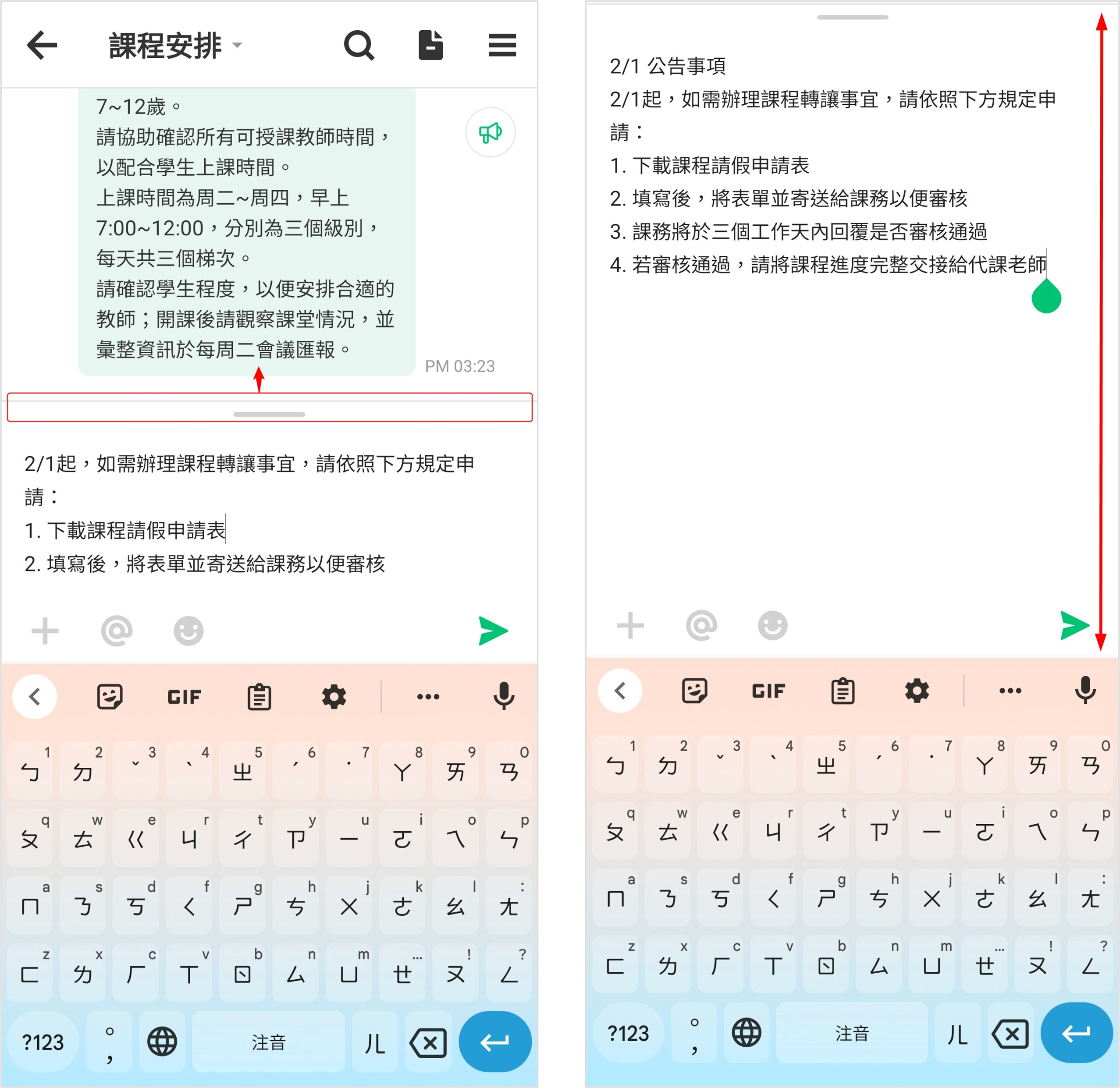 當在手機上編輯訊息時,總因輸入框較小,而不易輸入並預覽內容嗎?現在可以將訊息輸入框展開來,讓您在編輯訊息時,能更一目了然地查看所編輯的內容。在訊息輸入框上方,可以看見中段橫線,請將此橫線往上滑動。往上滑動橫線後,訊息輸入框將會往上展開。