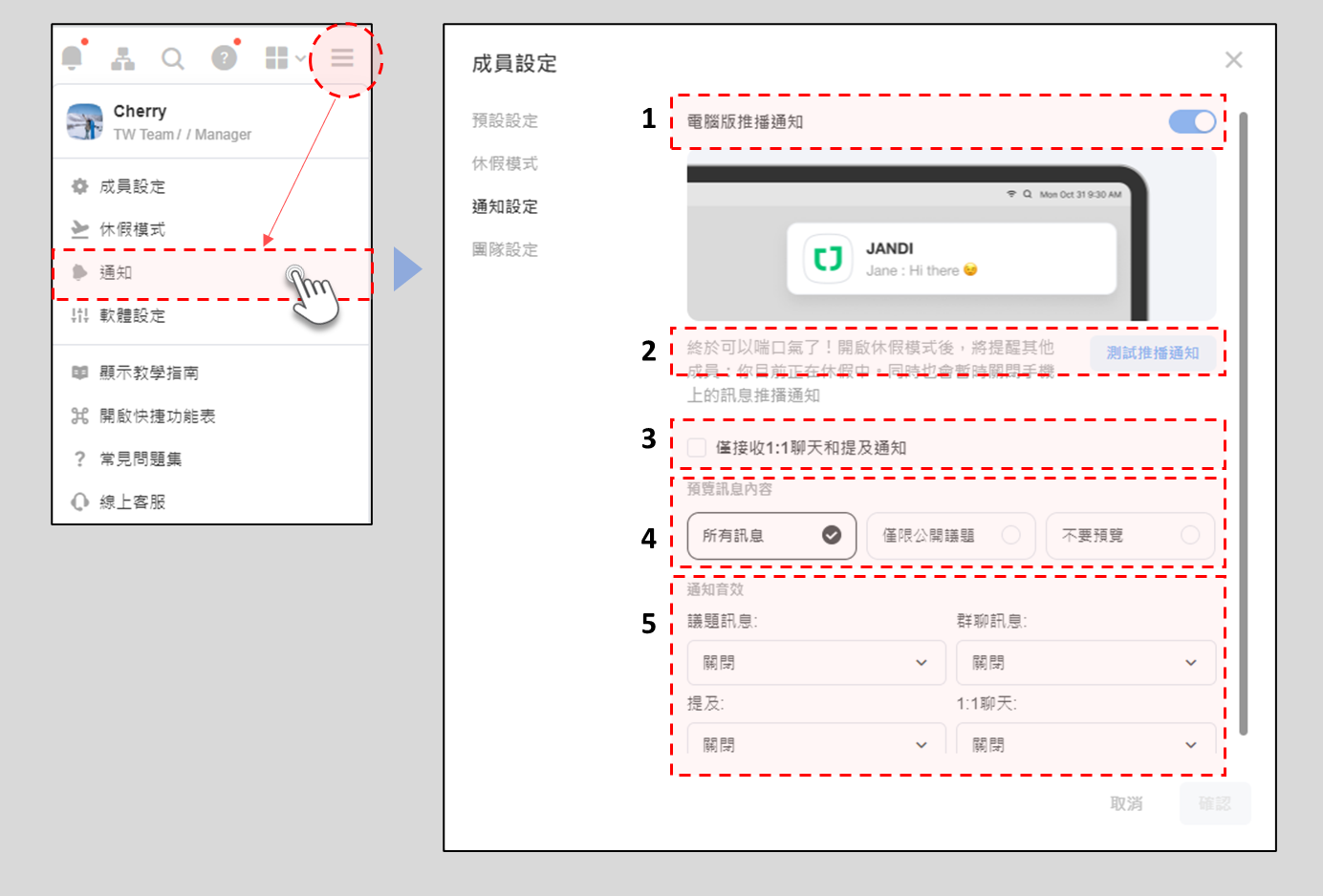 設定 JANDI 訊息桌面通知,不要錯過重要的工作內容!同時也可以設定通知聲音。