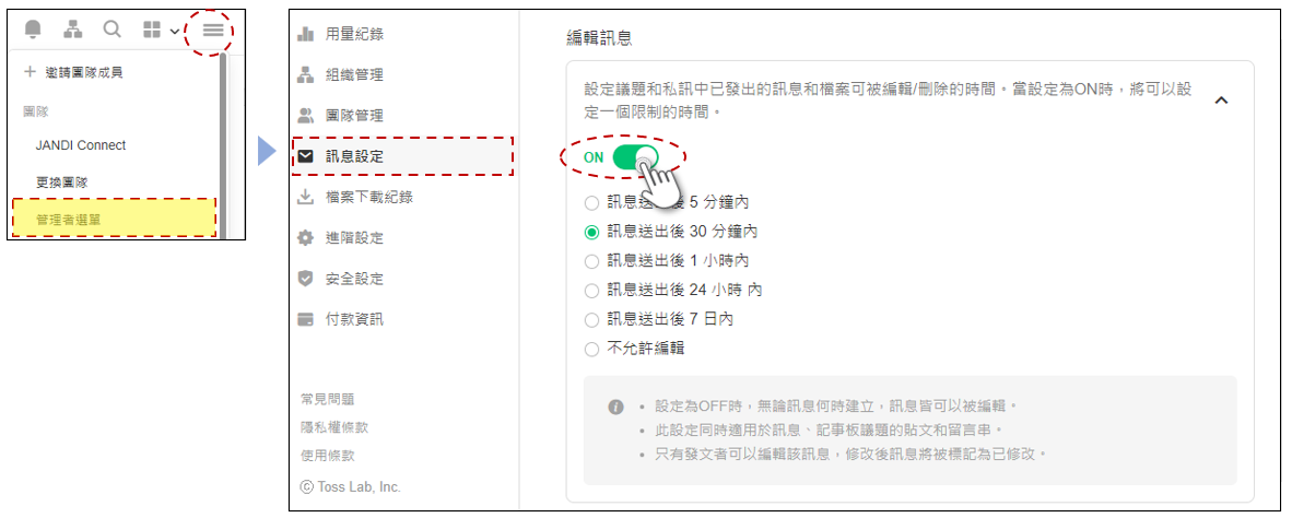 團隊預設時,訊息編輯功能的預設為「OFF」