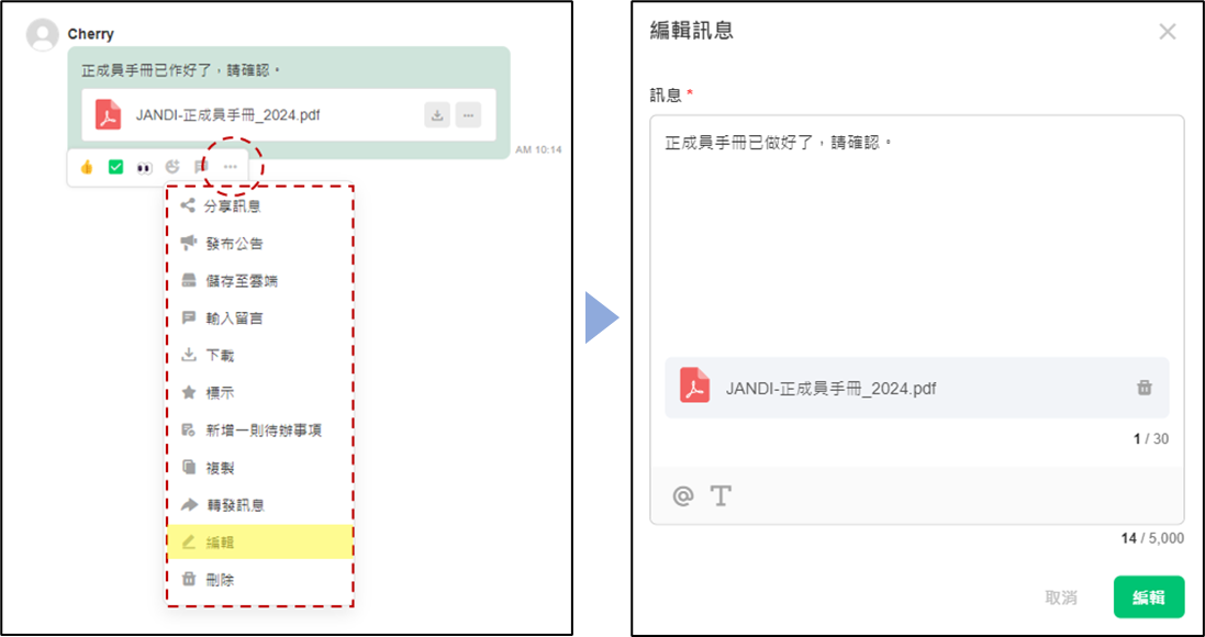 你是否曾因打錯字或附加錯誤檔案,而不得不刪除整則訊息重新發送?現在,JANDI 提供「編輯訊息」功能,讓你直接修改已發送的訊息,減少重發的困擾!