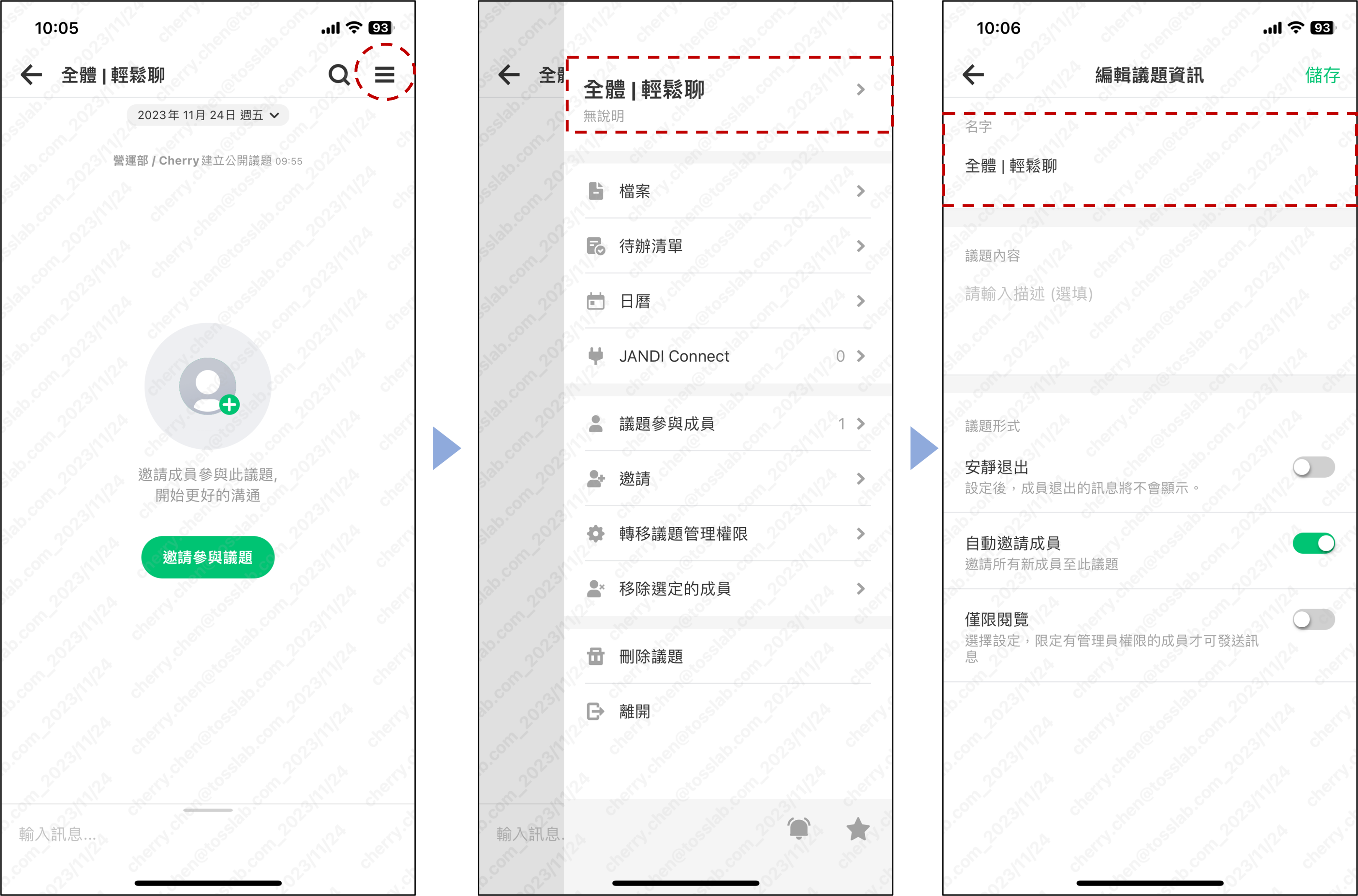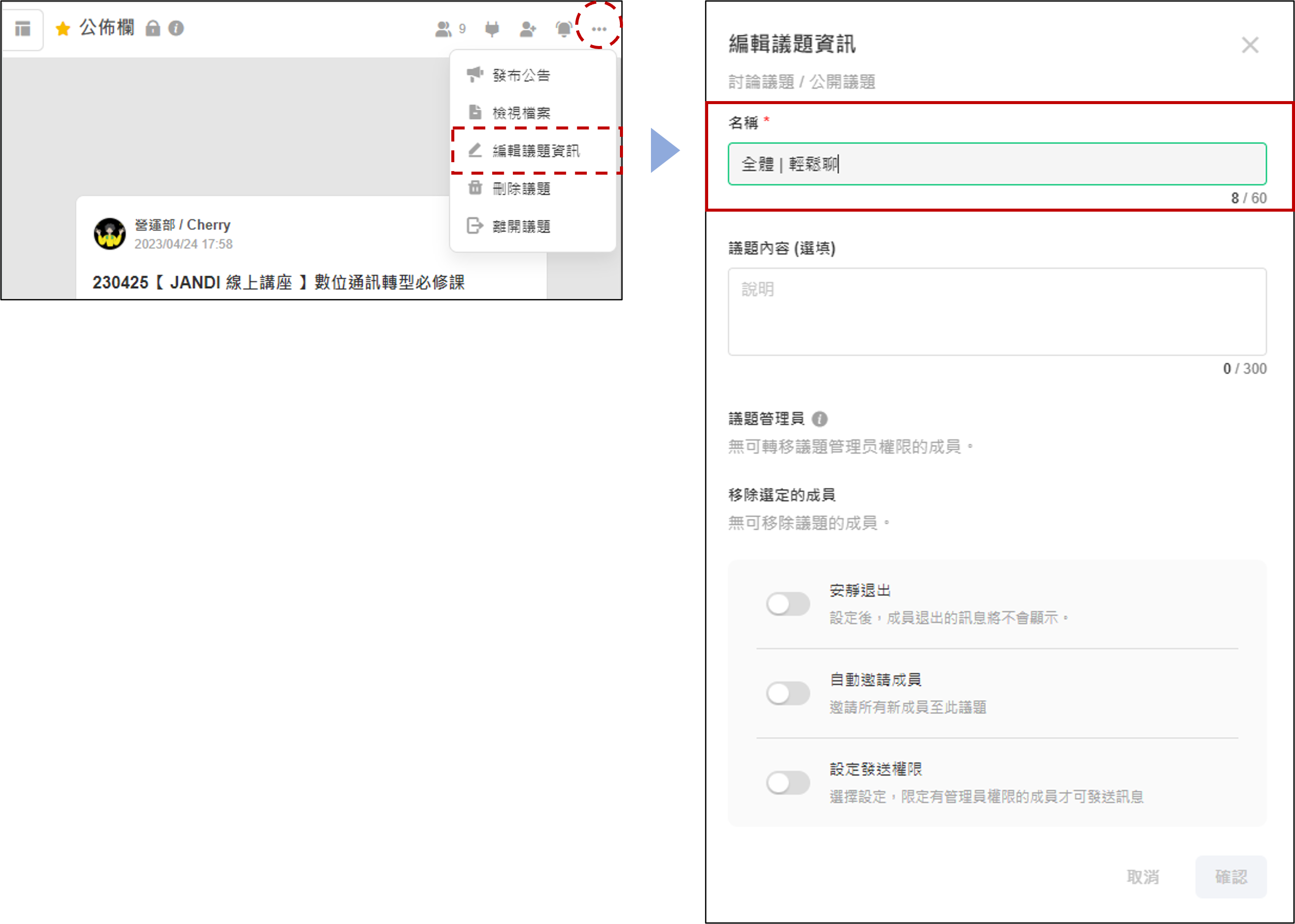 操作方式:議題右上角 [三] > 點擊 [議題名稱 > ] > 更改議題 [名字] >儲存