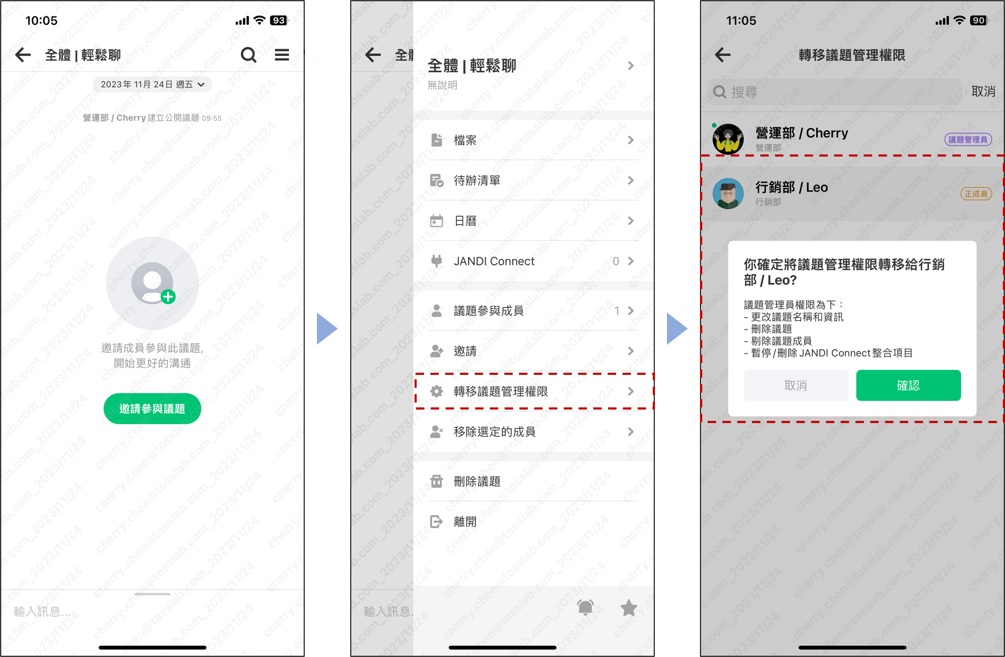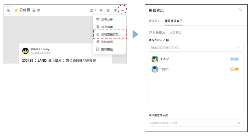 操作方式:議題右上角 [三] > 點擊 [轉移議題管理權限 ] > 點擊欲轉之成員 > 確認