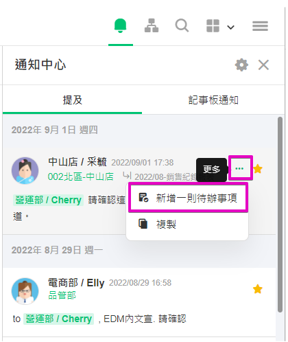 1.將被@提及訊息新增一則待辦事項,或將訊息標示為星號標記。