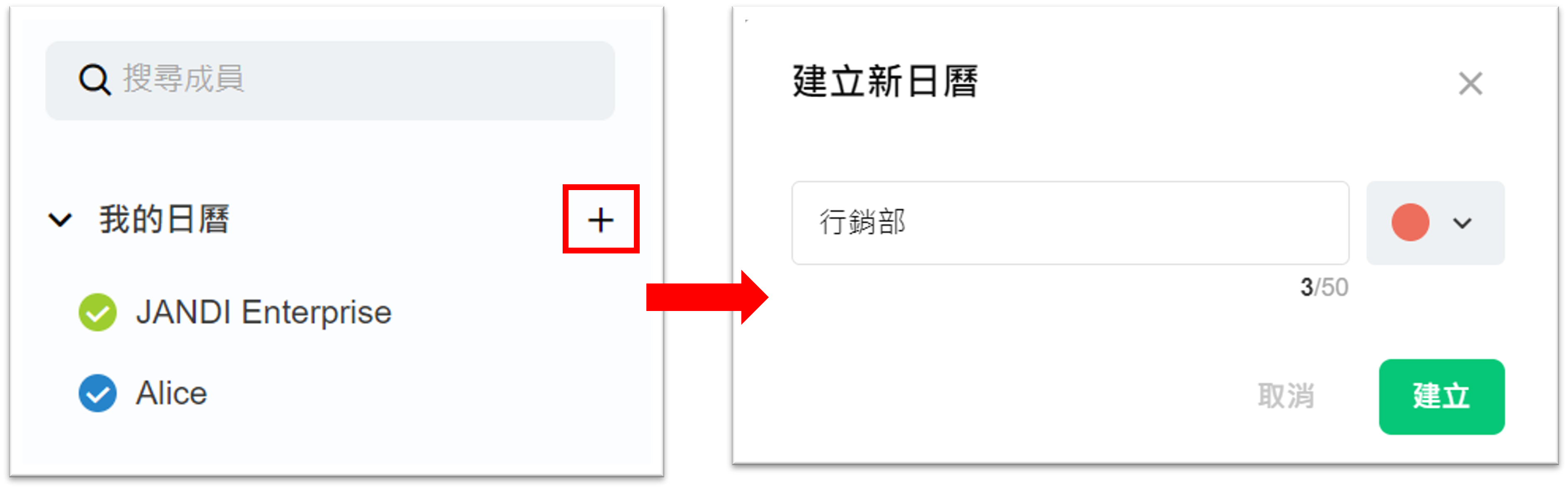 ② 日曆詳情:日曆管理者可以修改標題。任何人皆可更換日曆顏色。