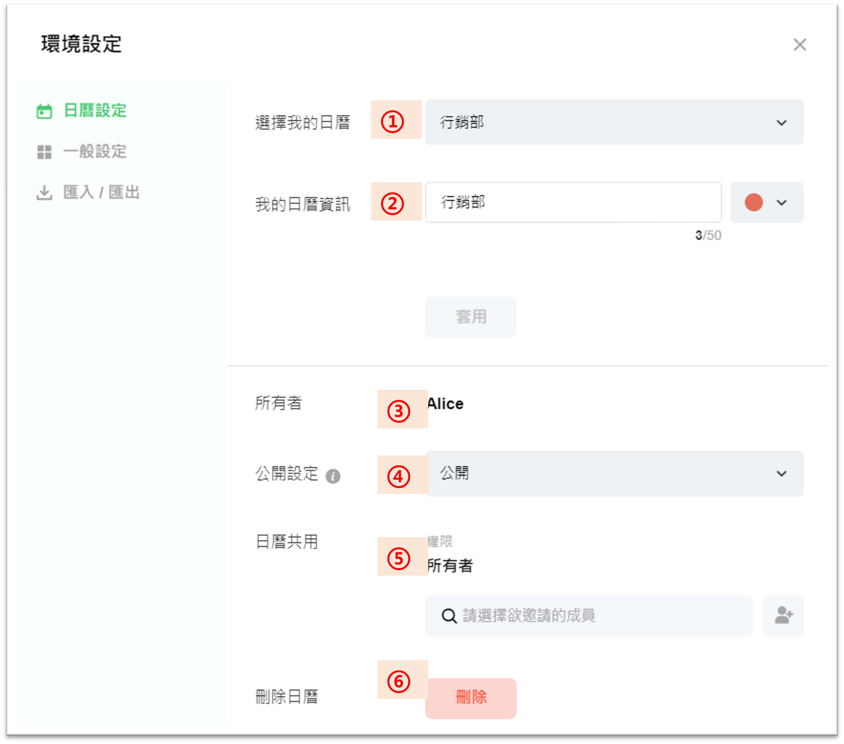 ⑥ 刪除日曆:如果您刪除日曆,所有成員將無法使用。