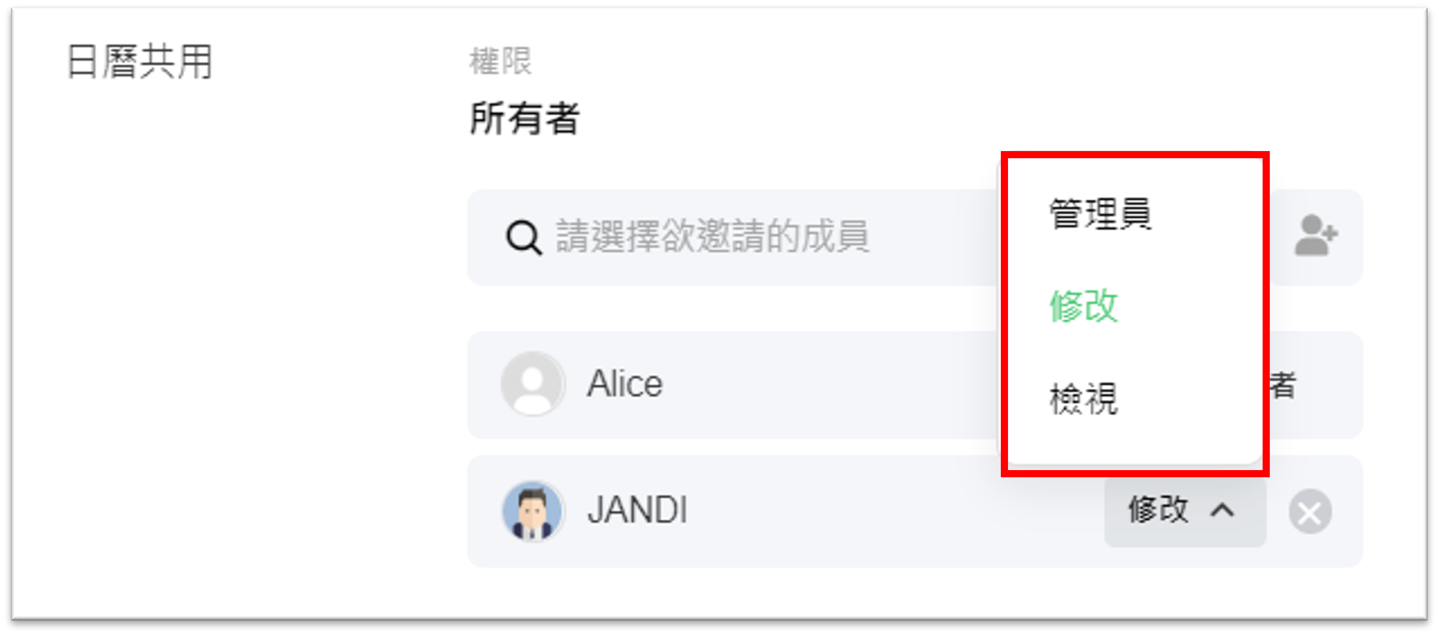 在選擇成員後,您可以授予成員日曆權限(管理員、修改、檢視)