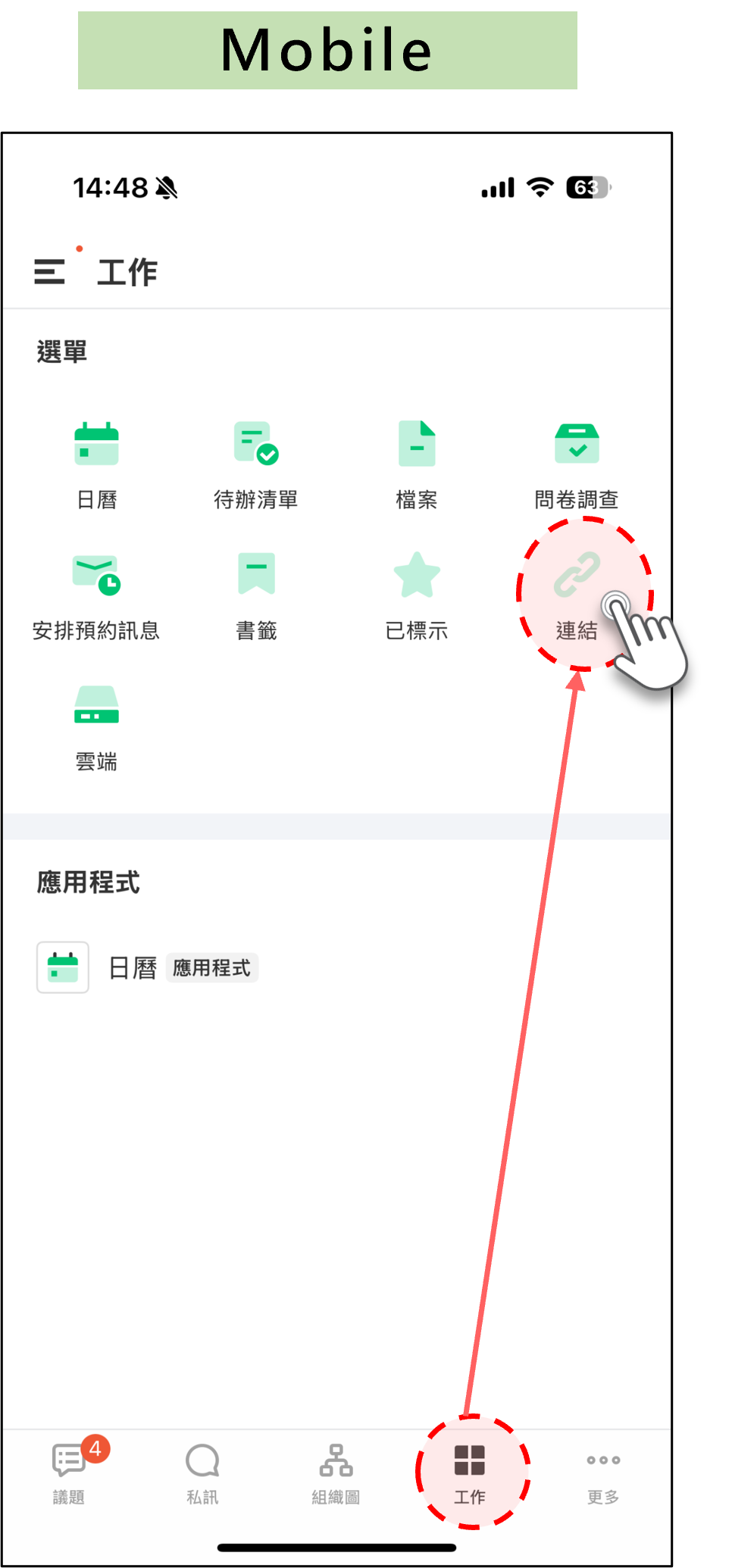 操作方式:點擊手機介面底部的 [工作] > [連結]