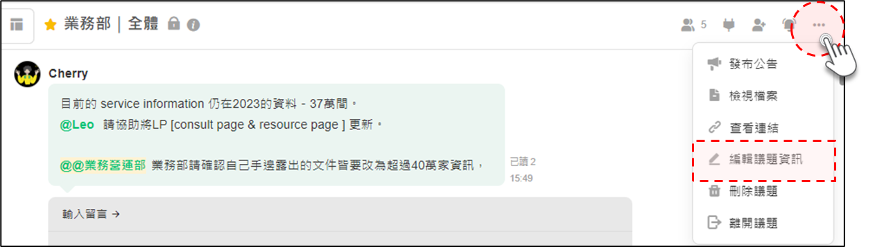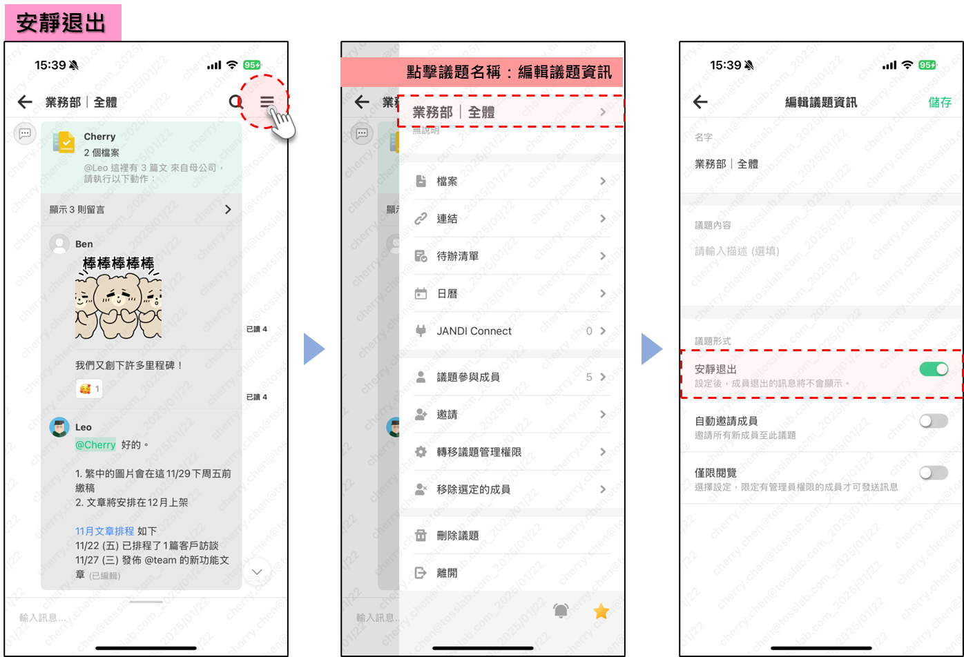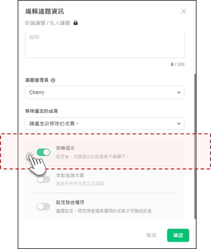 在企業內進行人員調整或部門重組時,將成員大量退出議題可能會影響團隊士氣與工作氛圍。因此,安靜退出 是針對議題的進階功能,旨在讓成員退出議題時,不顯示成員名稱的退出訊息,達到降低影響的效果。