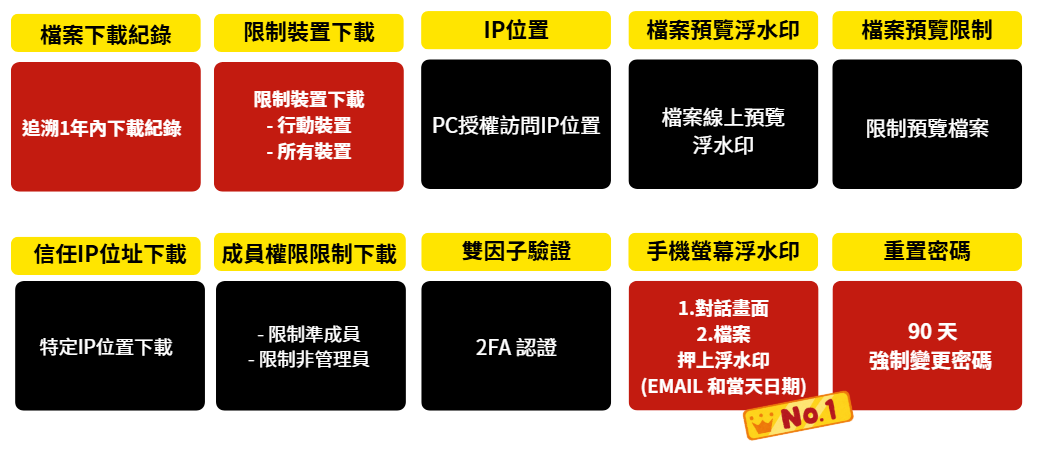 支援 IP 限制、檔案下載控管、雙重驗證等高階安全設定