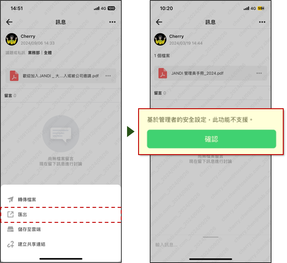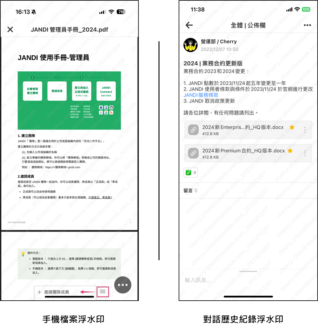 場景:截圖對話或開啟檔案截圖,則有帳號Email以及當天截圖日期浮水印。