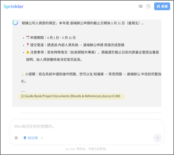 此功能可利用上傳至知識庫中的文件、數據與資訊,提供準確的答案或相關資料。特別適合需要根據公司現有資料進行問答或文件搜尋的情境。