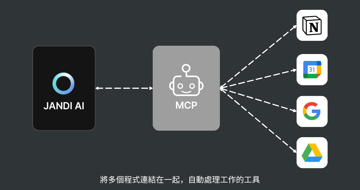簡單來說,MCP 就像一個「通道」,讓 AI 能夠收集最新資訊、連結外部系統以取得資料,並透過外部系統實際執行任務,使 AI 不僅依靠已訓練的資料回答,還能直接應用於工作,例如透過一次提問取得 CX 團隊頁面的主要行程,或者自動在Google日曆中建立行程。