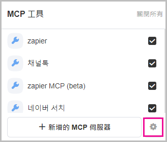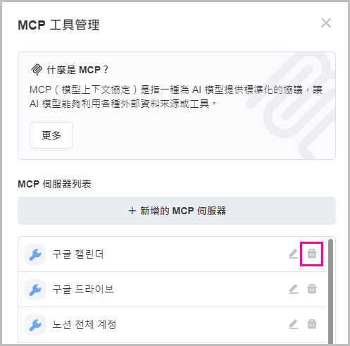 在MCP管理畫面中,找到要刪除的伺服器,點擊 [ 垃圾桶]
