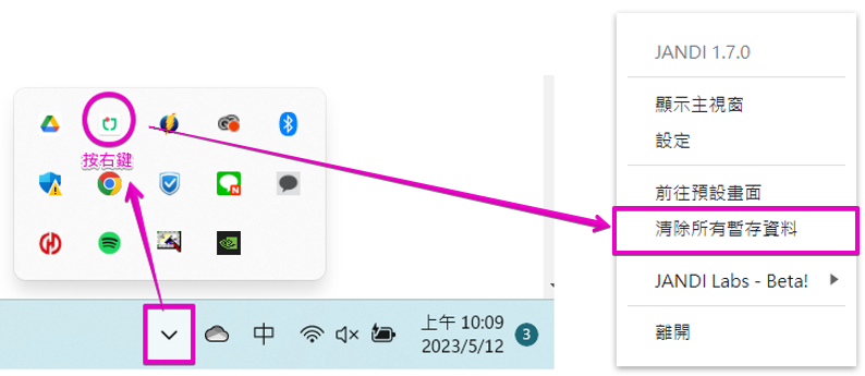 點擊 任務欄的 [^] > JANDI 圖示按右鍵 > 點擊 [清除所有暫存資料]