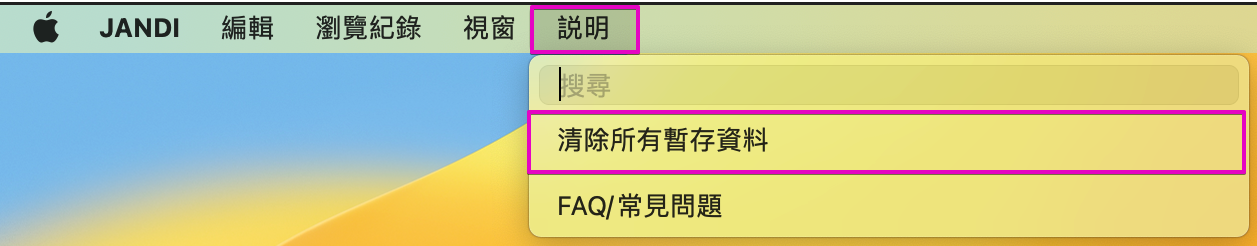 JANDI APP 選單 > 點擊 [說明] > 選擇 [清除所有暫存資料]