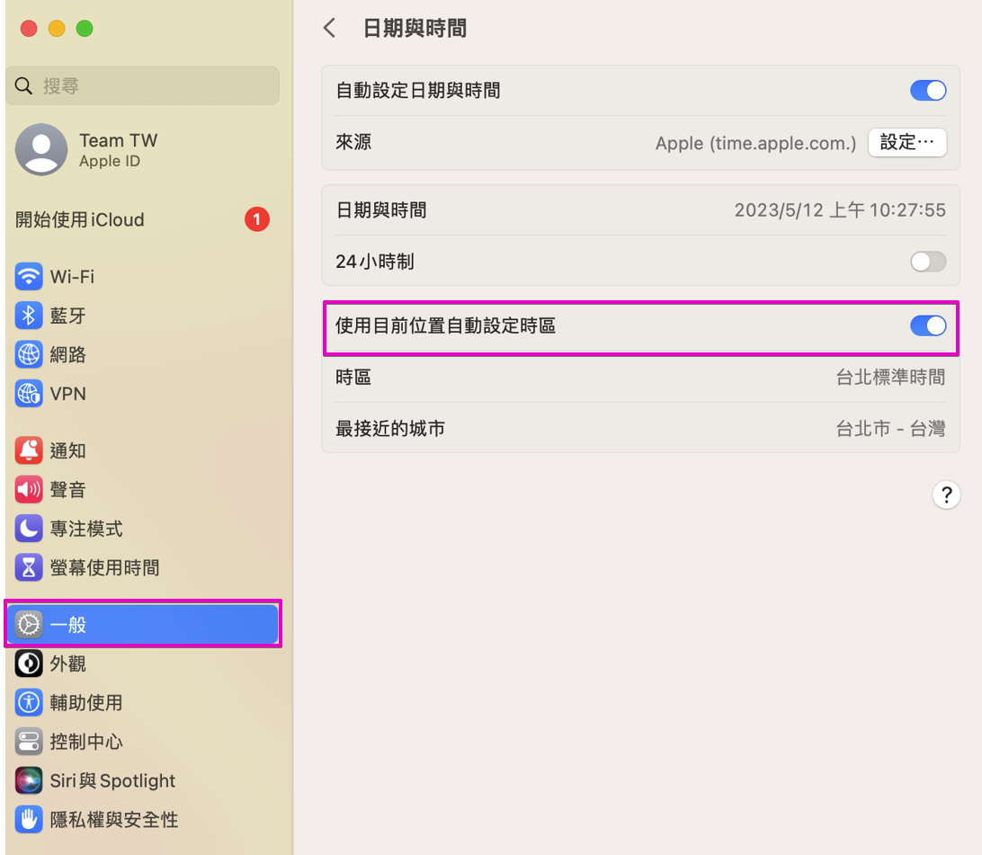 [系統偏好設置] - [日期與時間] - [時區: 台北台灣標準時間] - 重新啟動您的Mac