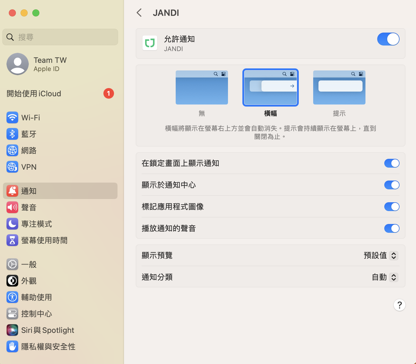 [系統偏好設置] > [通知] > 允許通知