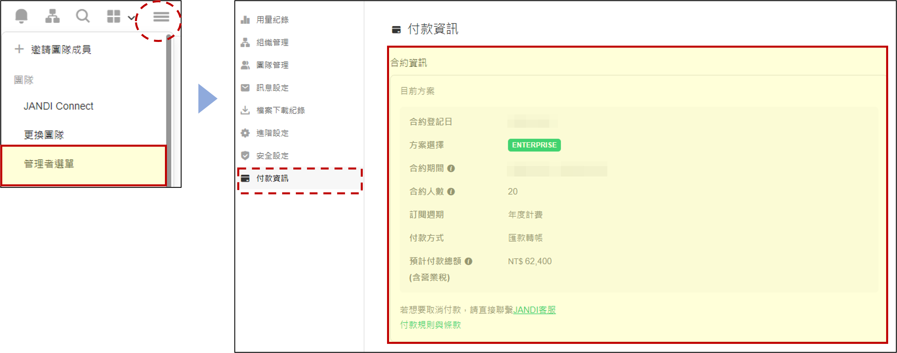 💡操作方式:JANDI右上角 [≡] >點擊 [管理者選單] >[付款資訊]> [合約資訊]。