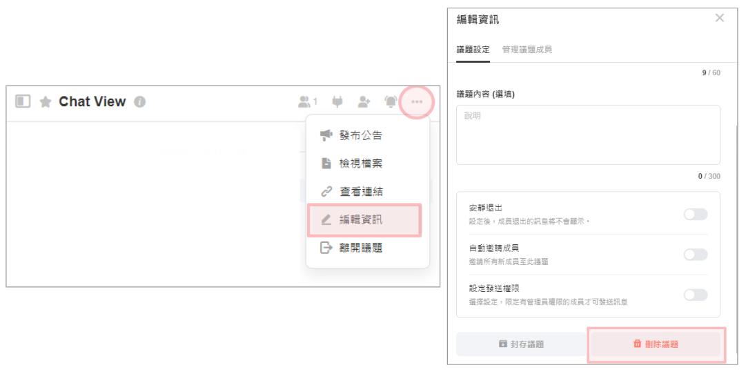 刪除議題:選擇議題右上角的[...] > [編輯資訊] > [刪除]