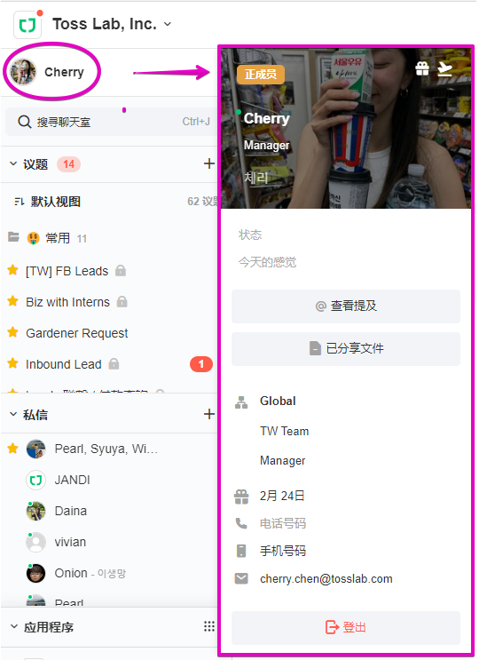 JANDI 个人简介分为两种:个人简介与团队內的个人简介