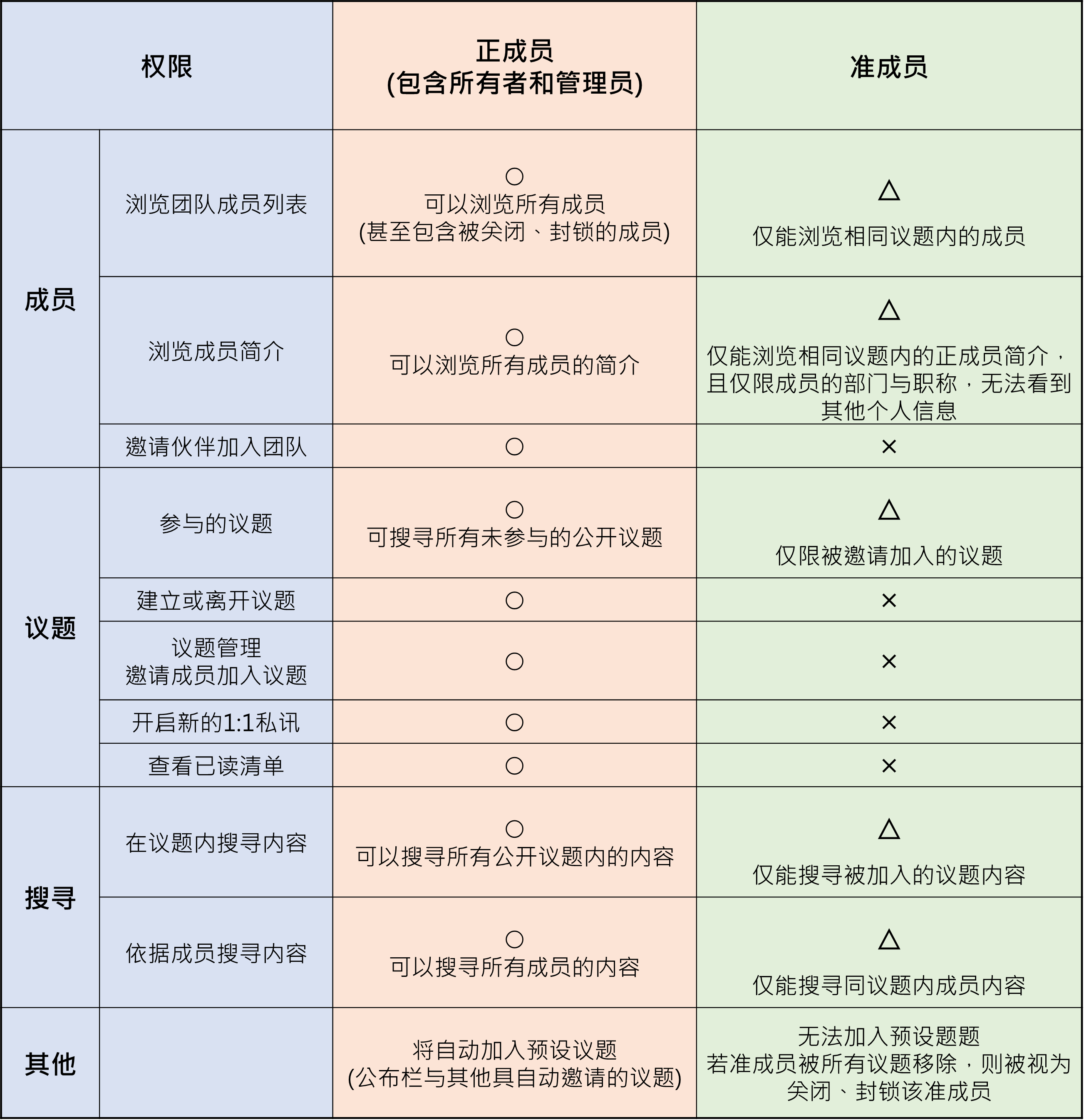 协作成员(原“准成员”):为功能受限的成员权限,适用于外部协作人员、兼职人员、合作厂商等对象。