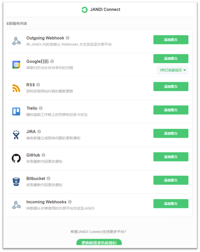 目前,JANDI 可串联于 Google 日历、RSS 订阅、Trello、JIRA、GitHub、Bitbucket 及 Incoming/Outgoing Webhooks