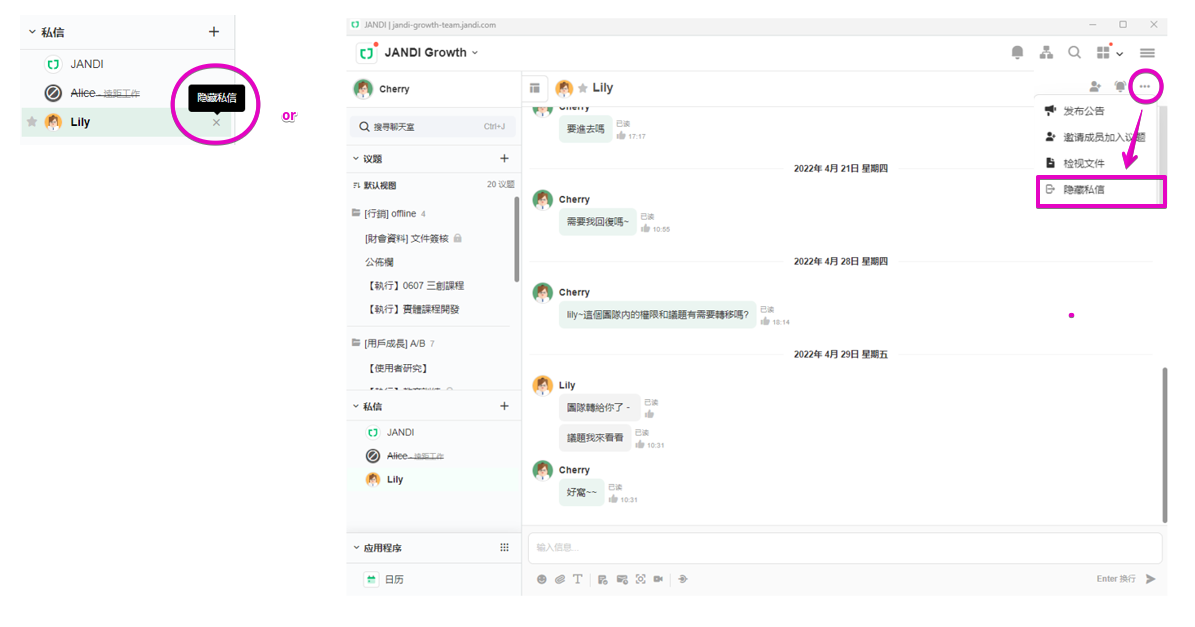 • 如何设定:介面底部的 [ ... 更多 ] > 管理员设定 > [ 团队管理 ] > [ 允许成员删除 1:1 聊天室 On ]
