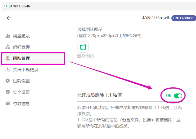 2. 右侧 [ 团队管理 ] > 开启 [ 允许成员删除 1:1 私讯 ]