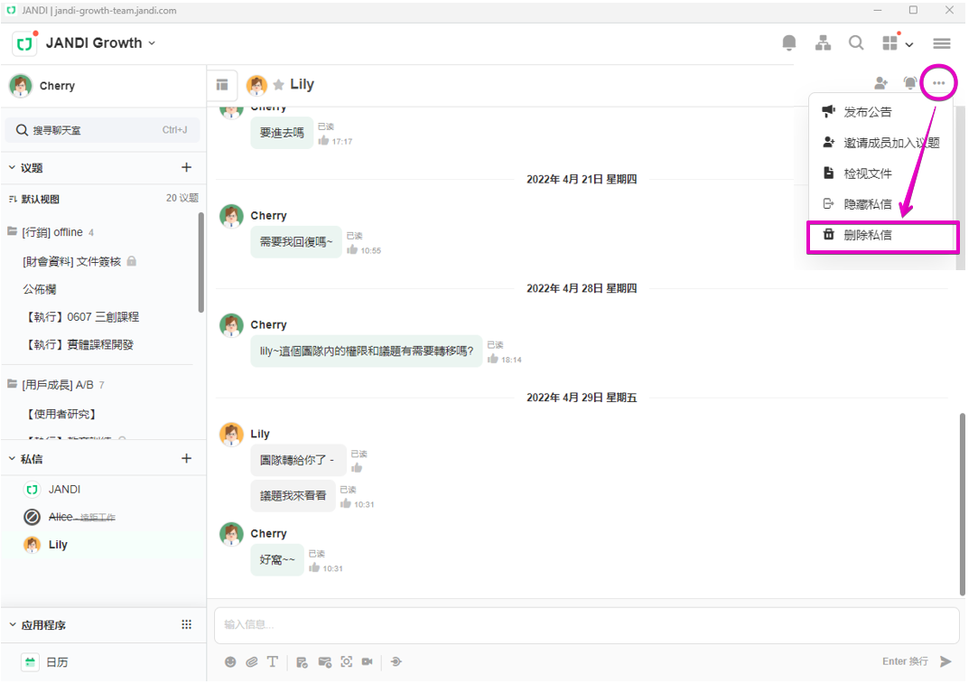请留意:团队管理员必须为成员打开设定才能使用删除 1:1 私讯功能。