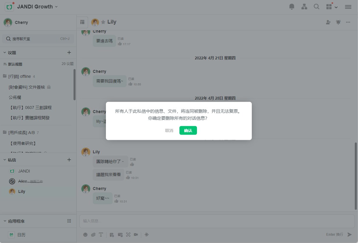 允许删除 1:1 私信视窗,将会删除私信中的所有消息、文件和投票。