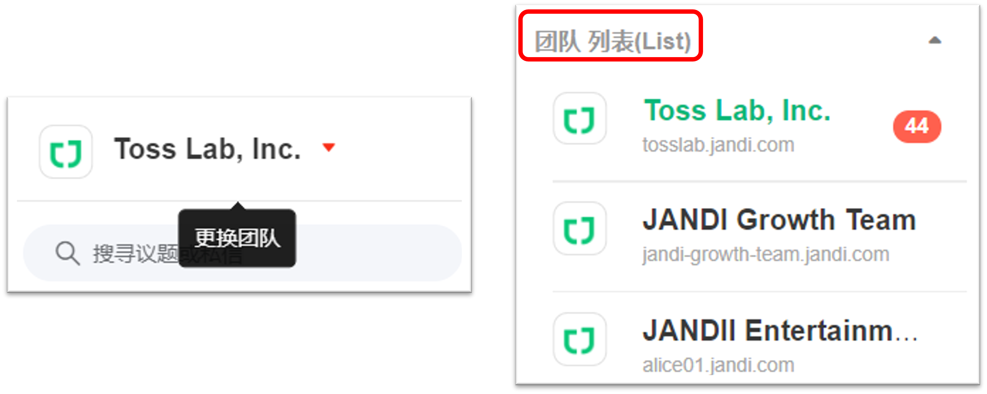 于 JANDI 介面左上角,点击团队名称并选择其他团队名称。