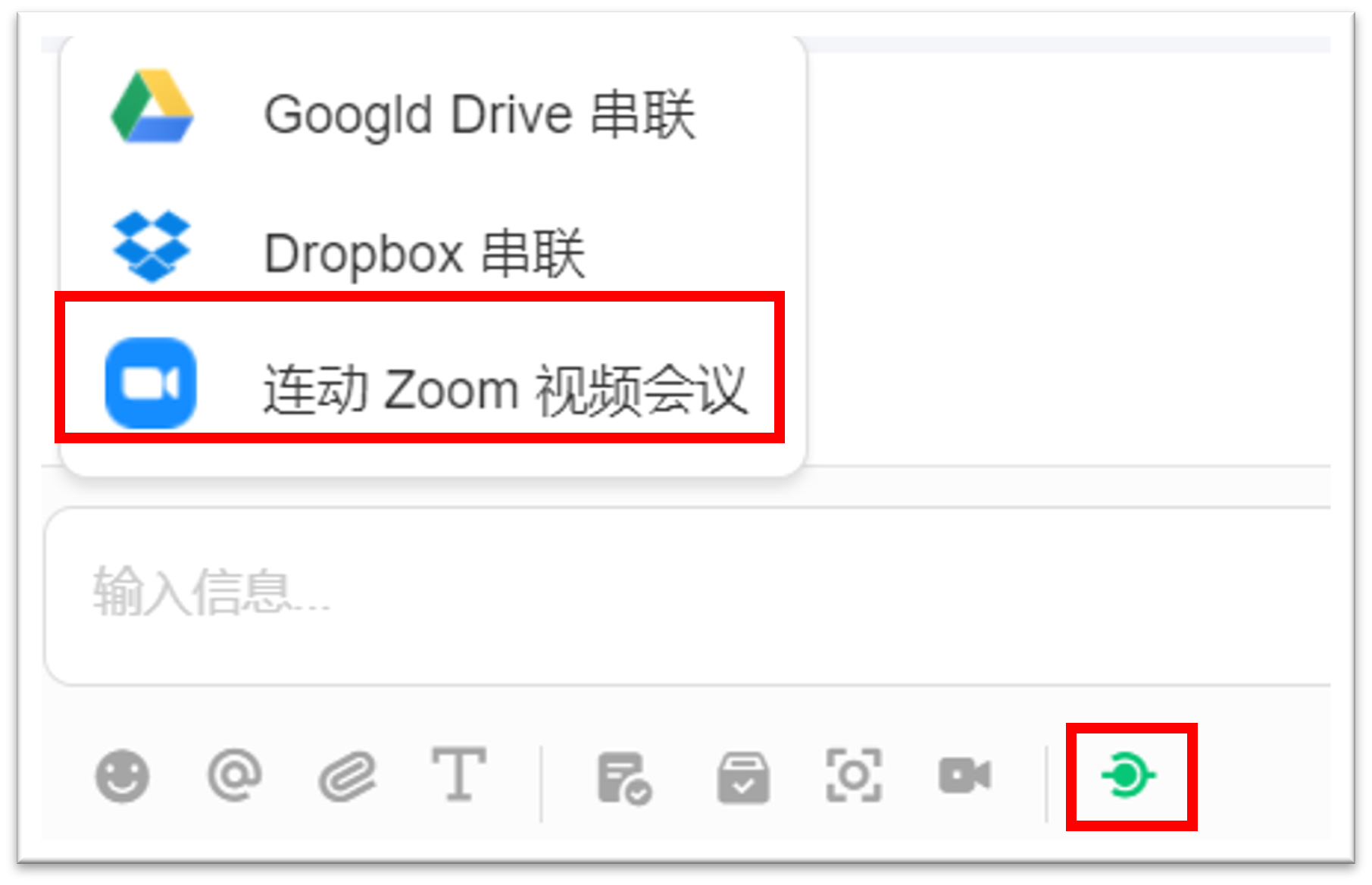 3-1) 点击电脑版 JANDI上信息输入框下方[整合串联] 按钮,并选择[Zoom]。