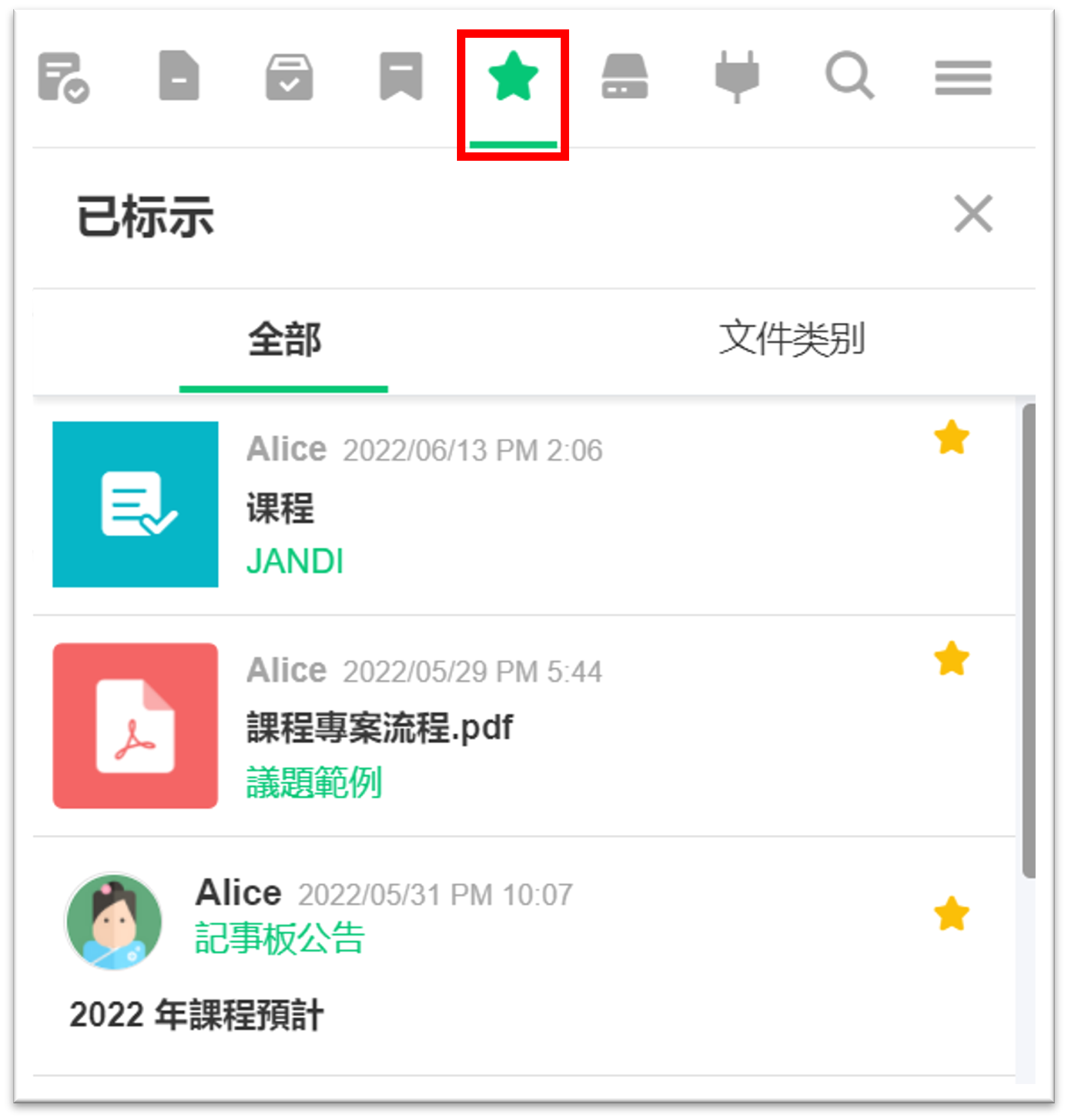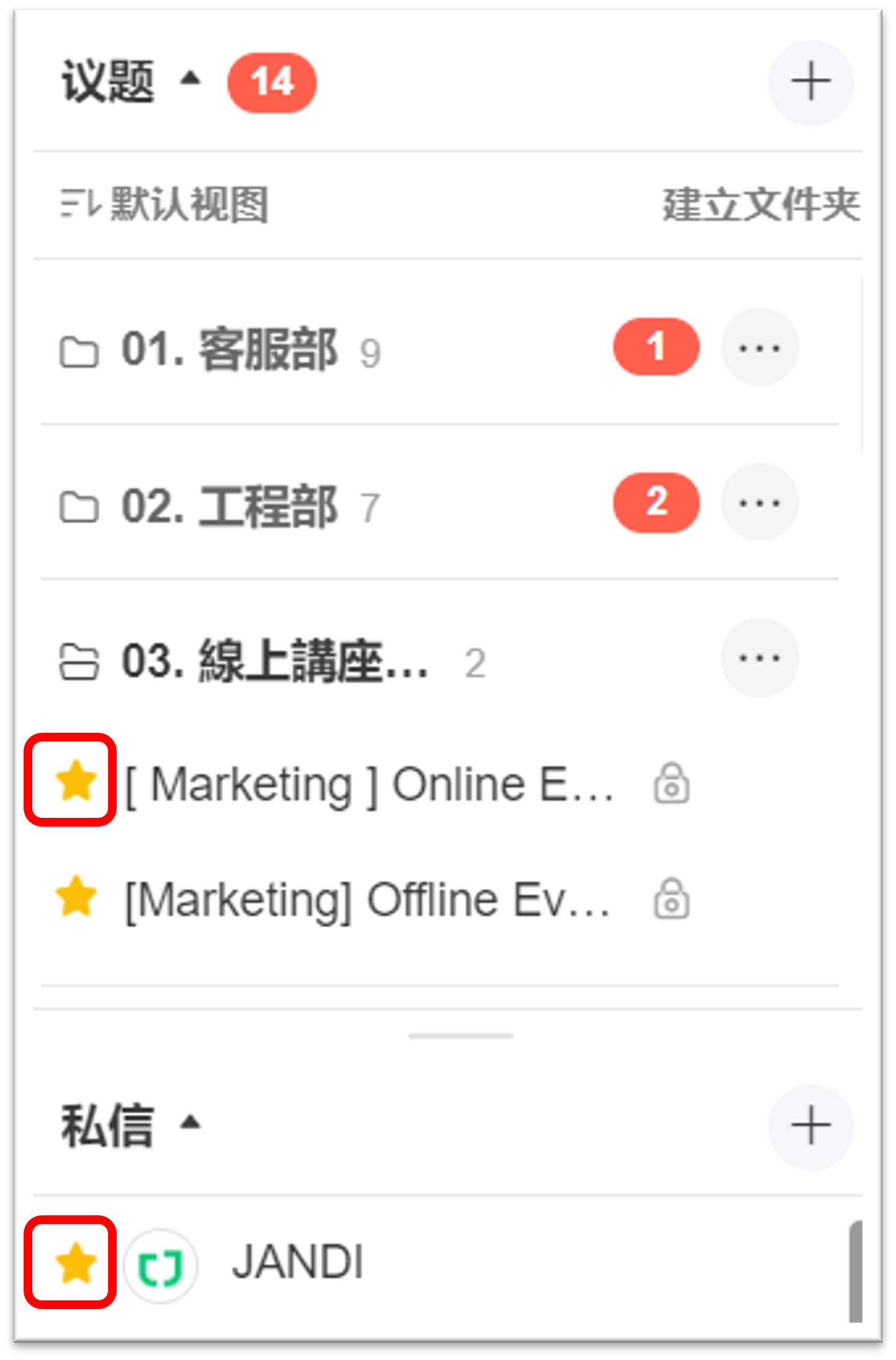 消息、文件、留言、投票:选择您要标示星号的内容右侧的⭐图示。 议题、私信:点击议题左侧⭐的图示,或要标示星号的成员。