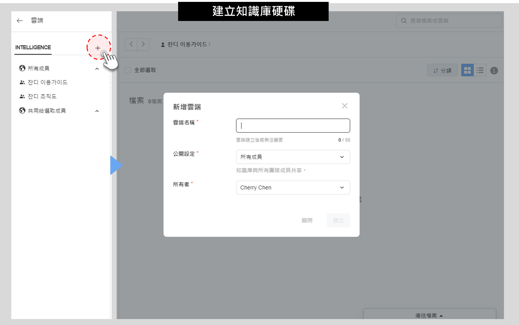 b. 建立知识库硬盘:点击 INTELLIGENCE (+) → 新建云端