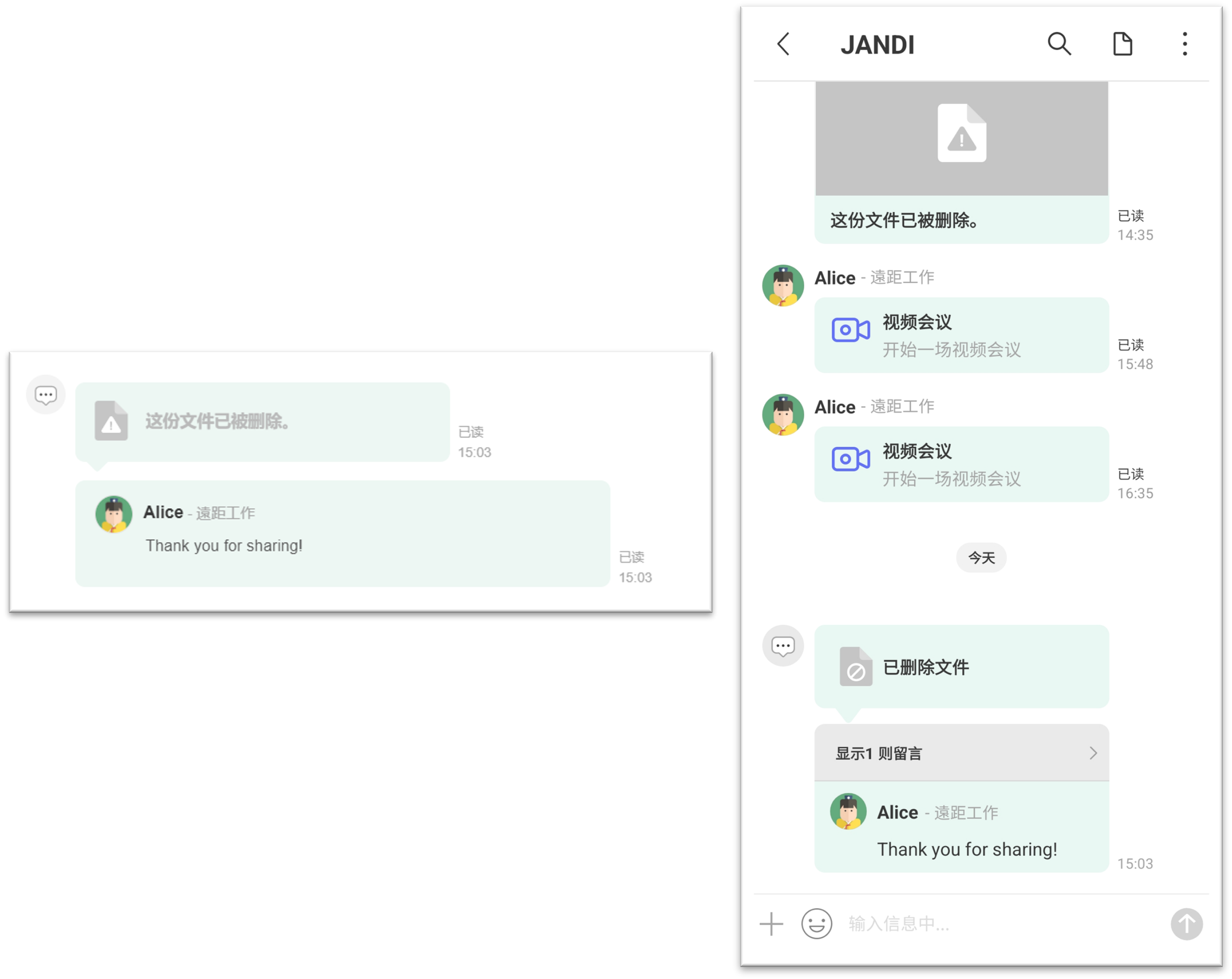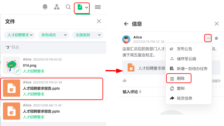 无论在电脑或手机版本中,将文件删除后,文件底下的留言仍会存在(如下图所示),以便于文件删除后的事后回溯。