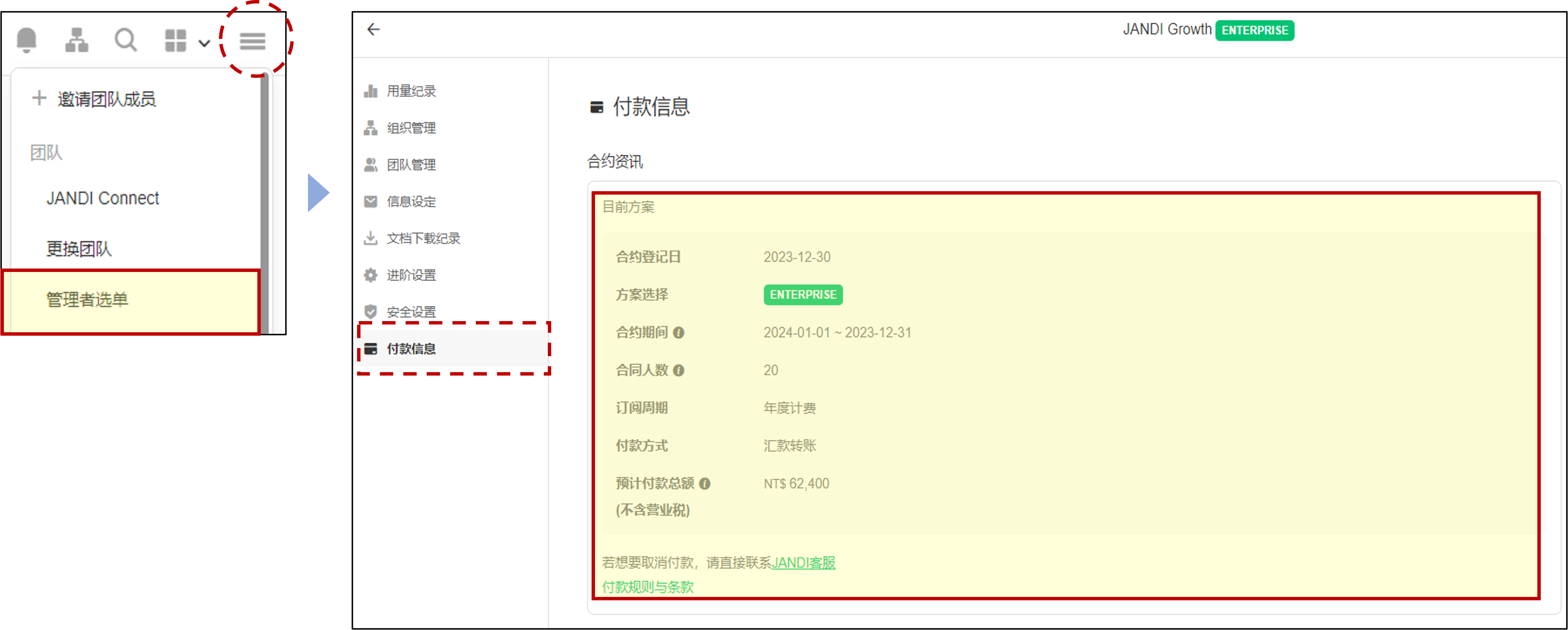 💡操作方式:JANDI右上角 [≡] >点击 [管理者选单] >[付款信息]> [合约资讯]。