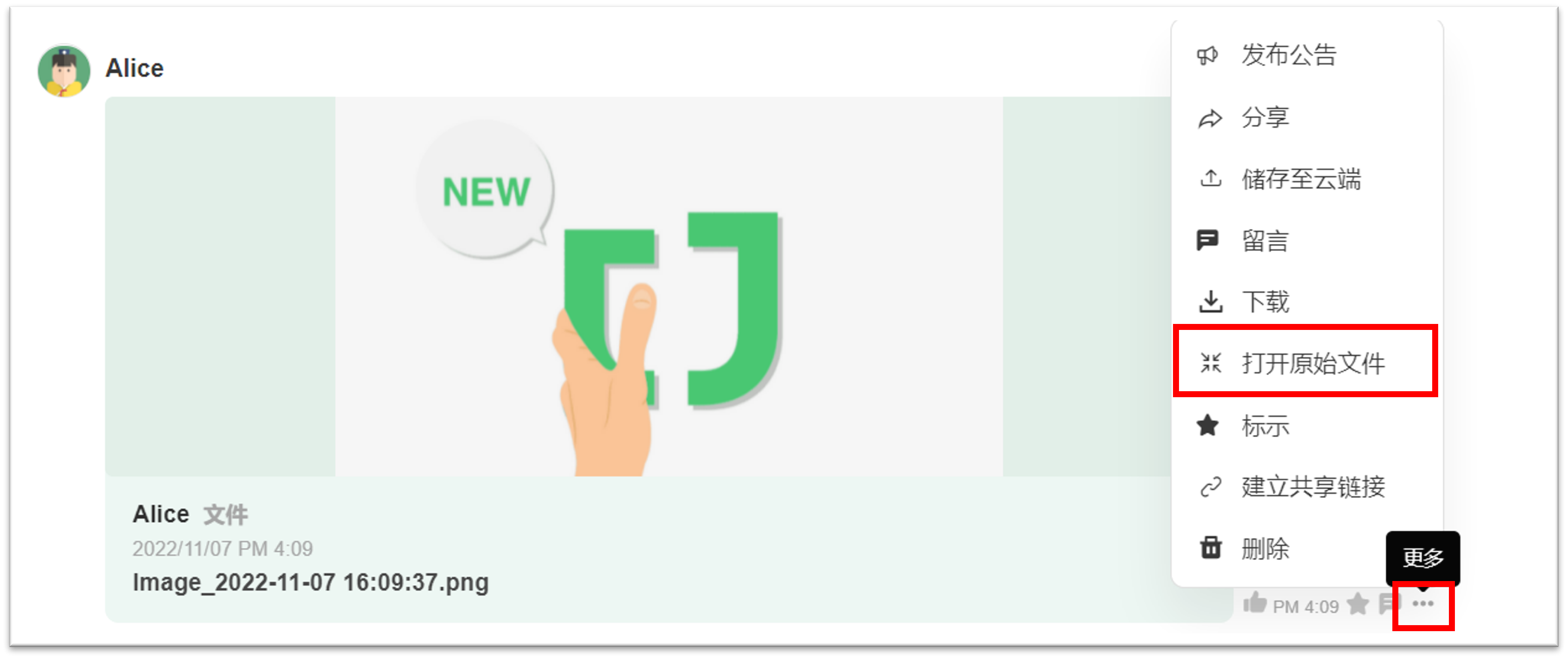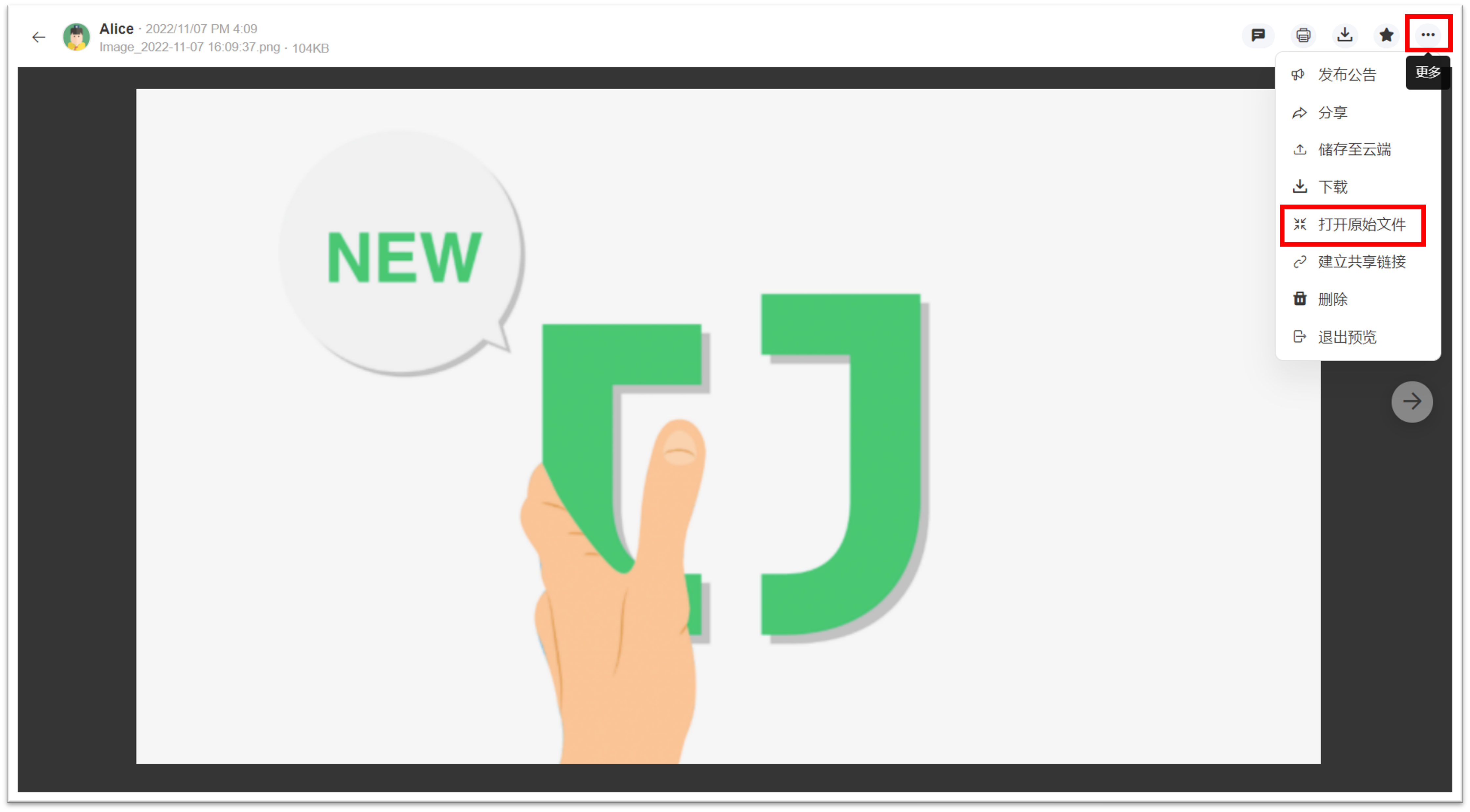 如果想要打开原始文件,也可打开预览图,在右侧上方的 [...] 更多 > 选择 [打开原始文件] 即可开启新窗口查看原始文件。