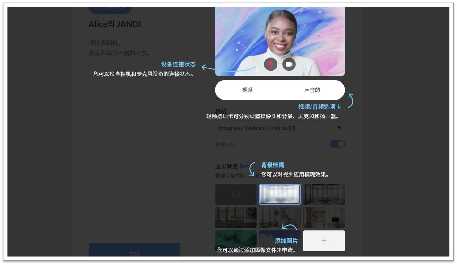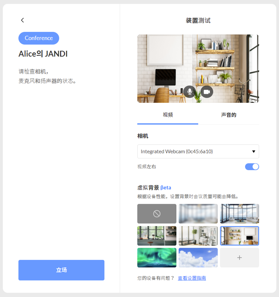 3. 进入Gooroomee 视频会议前,进行基本摄像头、麦克风及背景测试与设置后,点击左下方蓝底按钮进入视频会议。