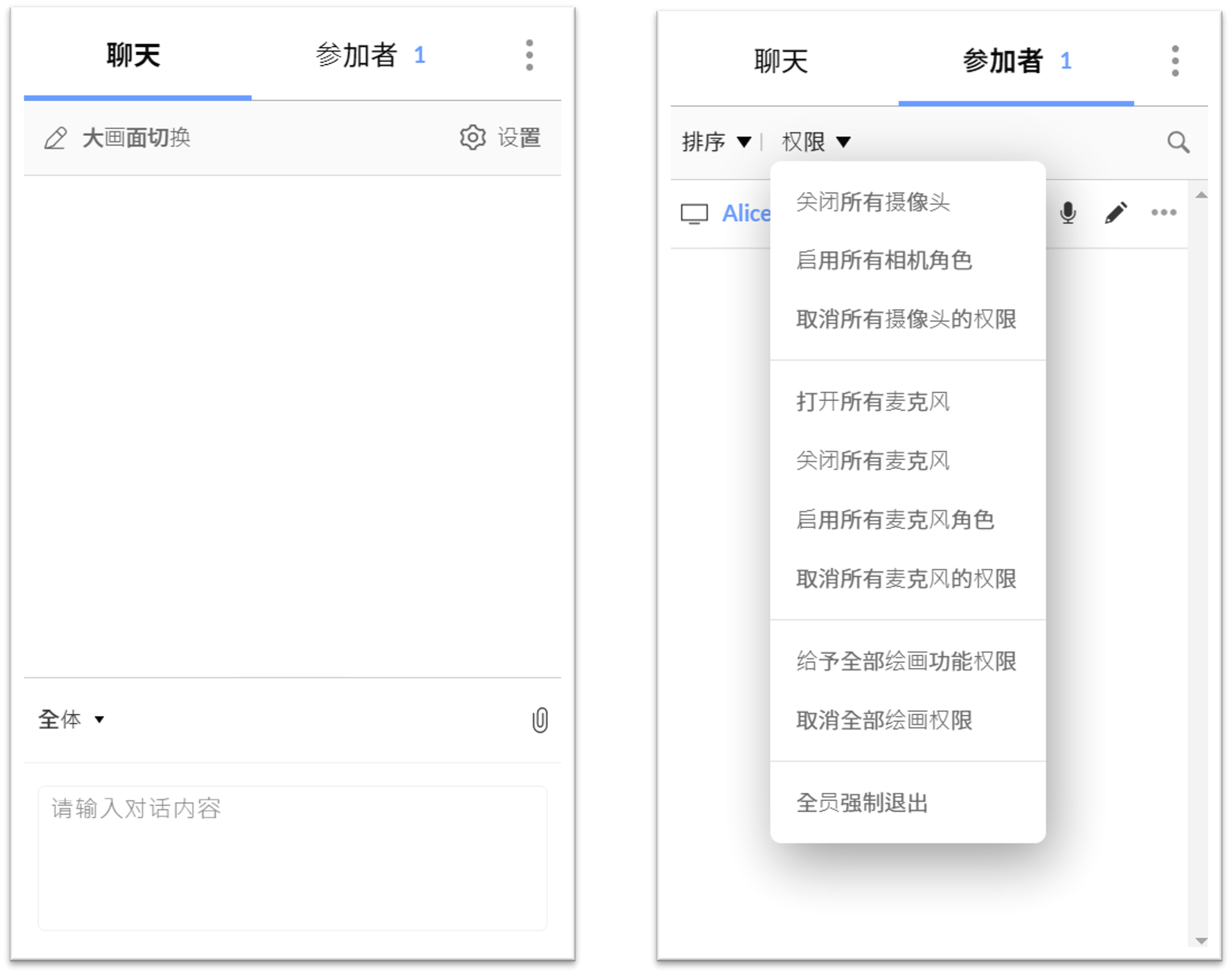 6. 于视频会议右侧,可查看目前会议中的对话聊天,且可选择想要对话的回想。亦可查看目前参加会议的与会者名单;会议主持人可限制与会者的权限。