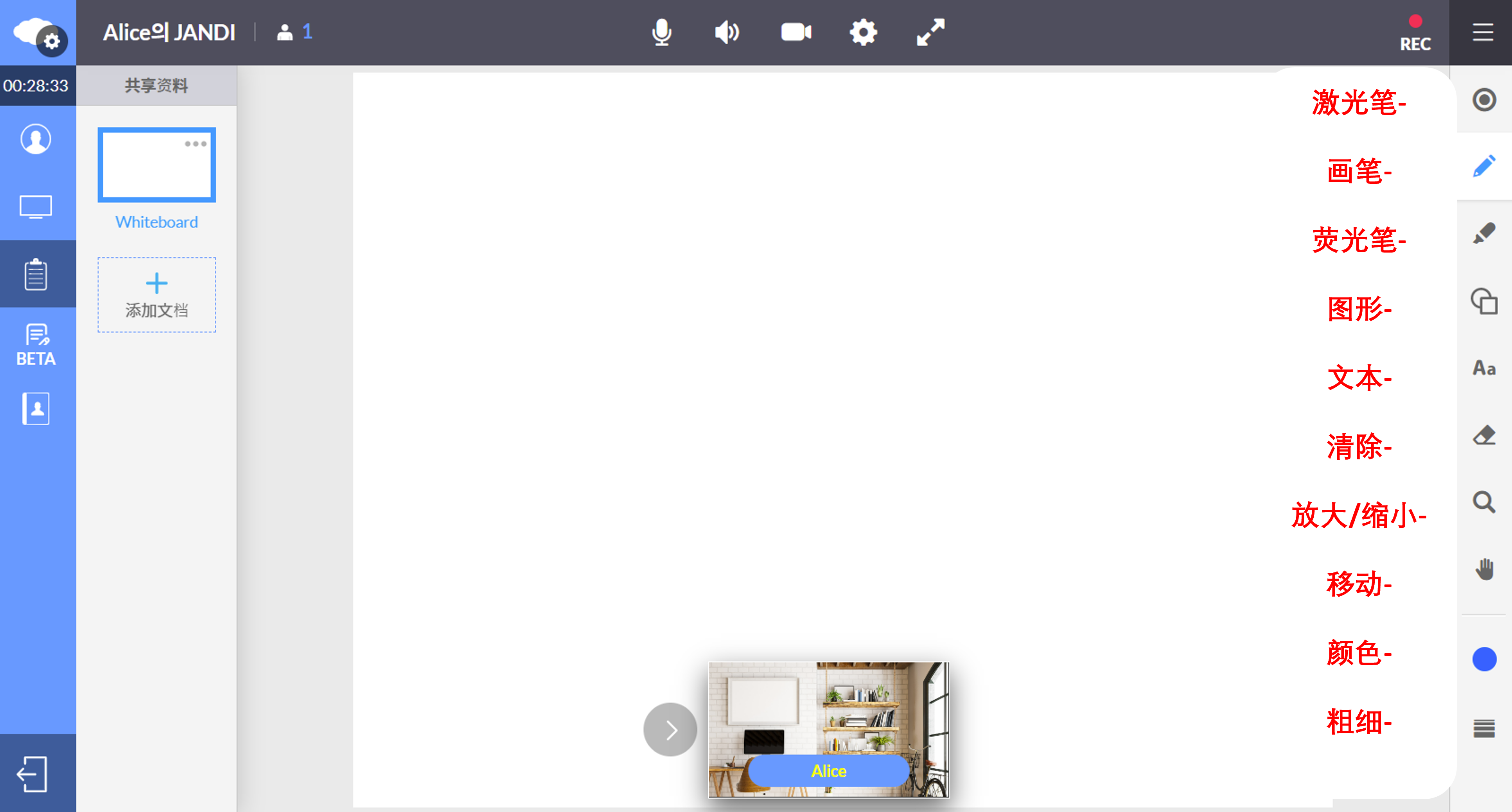 7. 若点击文档共享并选择共享白板,间出现如下图所示,右侧为白板功能选项。若您点击画笔,可于最底部选择画笔颜色。