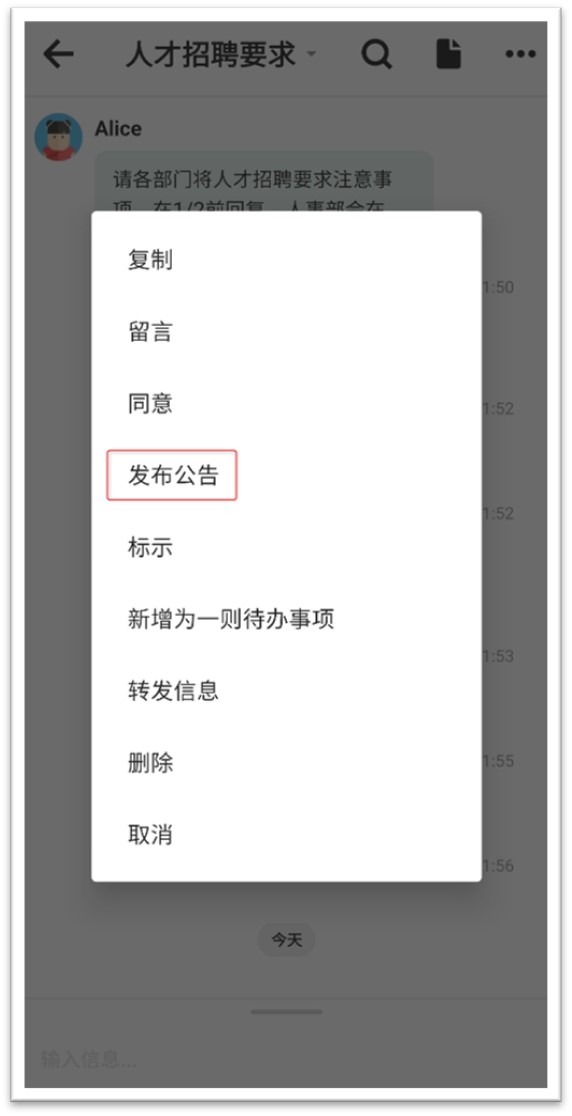 于选定的信息右侧看到 [...] 图示。单击 [...] 图示并选择 [发布公告]。