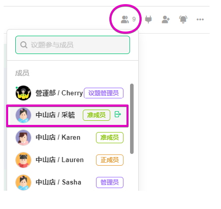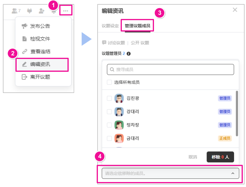 在议题中将成员移除(退出),有两种方式可以操作,以下将和您介绍