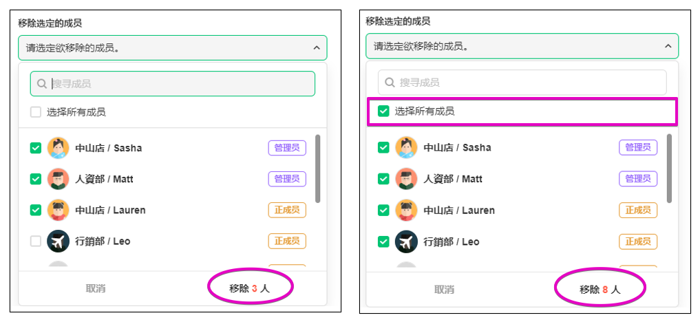 您可以移除选定的多位成员(左图);一次移除所有成员,点击「选择所有成员」(右图)> 选择「移除」后,成员将被退出。