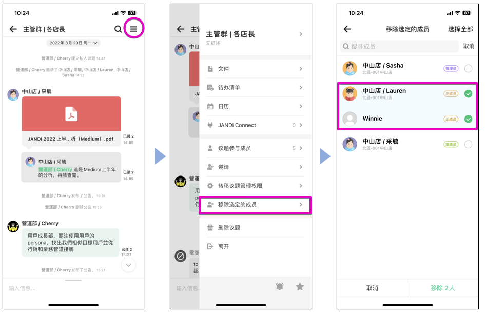 议题右上角的 [三] 图示 - 选择 [移除选定的成员] 以选择您要移除议题的成员。