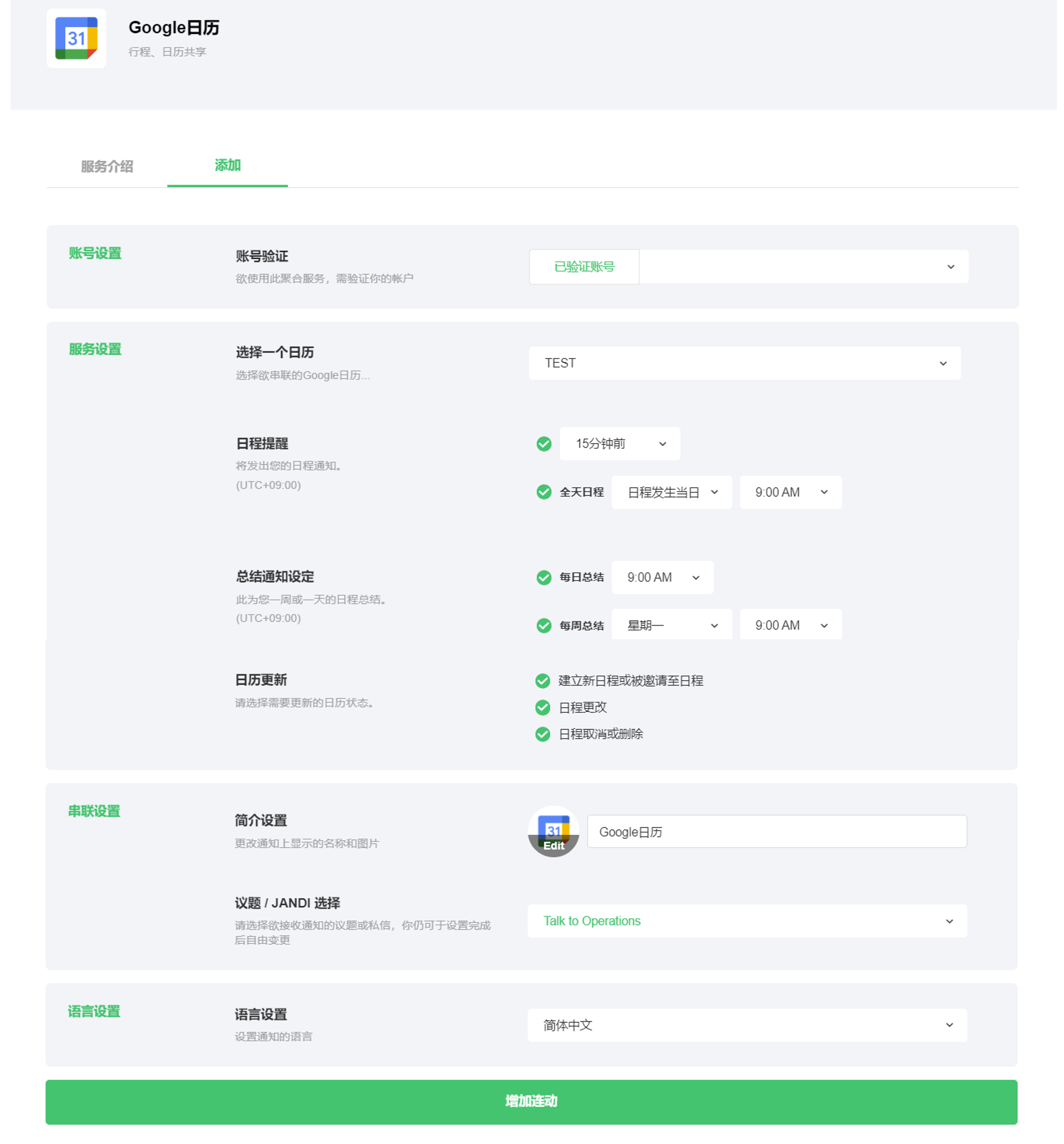 2. 确认欲串联的账号,选择欲串联的 Google 日历,同时再选取欲接收通知的议题或私信。 3. 安排日程提醒时间、设置总结通知设定与日历通知设定。 4. 进行个人化的通知设定,更改显示头像与显示串联名称。